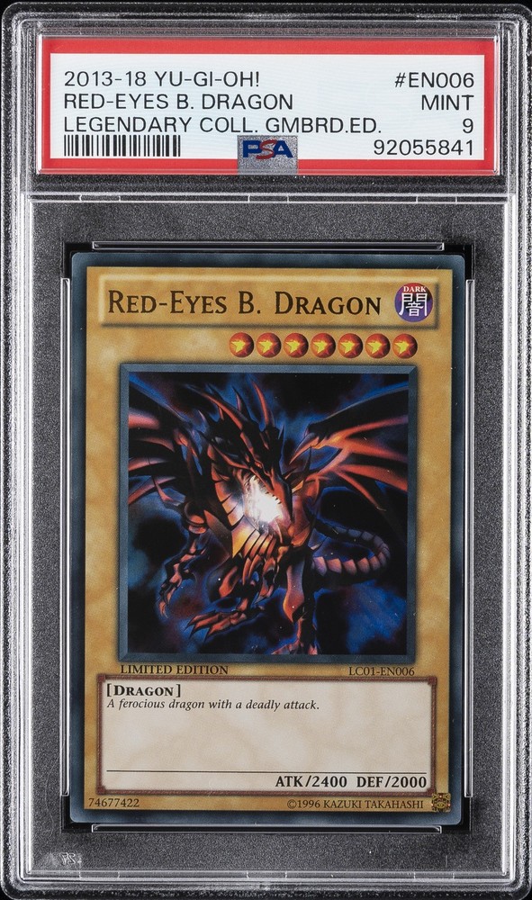 2013-2018 YU-GI-OH! LEGENDARY COLLECTION GAMEBOARD EDITION #EN006 RED-EYES B. DRAGON PSA 9 2013-2018 YU-GI-OH! LEGENDARY COLLECTION GAMEBOARD EDITION #EN006 RED-EYES B. DRAGON PSA 9 Purchase Info Thank you for your interest in bidding on this item consigned with PSA! By bidding on this item, you acknowledge and agree to the following terms: All sales are final. Returns not accepted. Payment must be made within 7 days of auction close. All items are sold "as is" and without warranty of Collectors Universe, Inc. (d/b/a PSA), and ANY AND ALL IMPLIED WARRANTIES ARE DISCLAIMED AND EXCLUDED. Sales tax may apply depending on shipping address. PSA does not guarantee that another third-party grading company's authentication or certification of an item as genuine is correct or accurate. Neither a difference of opinion between third-party grading companies about authenticity, nor a company's subsequent reversal of its earlier authentication or certification of an item, will be a basis for rescinding a sale. Any dispute with another third-party grading company relating to the authenticity of an item must be resolved directly with that other company. Collectors' maximum liability in the event of loss or damage to an item during shipping will be the lesser of (a) the price paid for the item and (b) the change in fair market value of the item. You release Collectors from all other liability including for any claims of punitive damages, emotional distress, consequential damages, lost profits, or lost interest, except as prohibited by law. Shipping Purchased Items will be shipped directly from PSA Vault. You stay hands-free. PSA Vault When you purchase this item, you can save on sales tax and selling fees by keeping it in the PSA Vault, official Vault of eBay. Items already in PSA Vault and will be sent to PSA Vault will have no shipping charge Storage of any items with the PSA Vault will be subject to the PSA Vault Terms of Service. Consignment PSA has competitive auction rates on the world's largest collectibles marketplace with the option to list from the PSA Vault or immediately after PSA authentication and grading. Sale Price Under $100 $100 - $499 $500 - $999 $1,000 - $2,499 $2,500 - $4,999 $5,000+ Seller Fee 13% + $3 flat 13% 12% 10% 9% 7% Sellers pay a single fee as reflected above; no additional eBay fees are incurred.