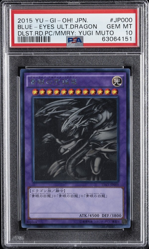 2015 YU-GI-OH! JAPANESE 15AX-DUELIST ROAD PIECE OF MEMORY SIDE: YUGI MUTO #JP000 BLUE-EYES ULTIMATE DRAGON PSA 10 2015 YU-GI-OH! JAPANESE 15AX-DUELIST ROAD PIECE OF MEMORY SIDE: YUGI MUTO #JP000 BLUE-EYES ULTIMATE DRAGON PSA 10 Purchase Info Thank you for your interest in this item consigned with PSA! By purchasing or making an offer on this item, you acknowledge and agree to the following terms: All sales are final. Returns not accepted. Payment must be made upon purchase of the item. All items are sold "as is" and without warranty of Collectors Universe, Inc. (d/b/a PSA), and ANY AND ALL IMPLIED WARRANTIES ARE DISCLAIMED AND EXCLUDED. Sales tax may apply depending on shipping address. PSA does not guarantee that another third-party grading company's authentication or certification of an item as genuine is correct or accurate. Neither a difference of opinion between third-party grading companies about authenticity, nor a company's subsequent reversal of its earlier authentication or certification of an item, will be a basis for rescinding a sale. Any dispute with another third-party grading company relating to the authenticity of an item must be resolved directly with that other company. Collectors' maximum liability in the event of loss or damage to an item during shipping will be the lesser of (a) the price paid for the item and (b) the change in fair market value of the item. You release Collectors from all other liability including for any claims of punitive damages, emotional distress, consequential damages, lost profits, or lost interest, except as prohibited by law. Shipping Purchased Items will be shipped directly from PSA Vault. You stay hands-free. PSA Vault When you purchase this item, you can save on sales tax and selling fees by keeping it in the PSA Vault, official Vault of eBay. Items already in PSA Vault and will be sent to PSA Vault will have no shipping charge Storage of any items with the PSA Vault will be subject to the PSA Vault Terms of Service. Consignment PSA has competitive rates on the world's largest collectibles marketplace with the option to list from the PSA Vault or immediately after PSA authentication and grading. Sale Price Under $100 $100 - $499 $500 - $999 $1,000 - $2,499 $2,500 - $4,999 $5,000+ Seller Fee 16% 14% 13% 10% 9% 7% Sellers pay a single fee as reflected above; no additional eBay fees are incurred. There is a $5 minimum fee on sold items.