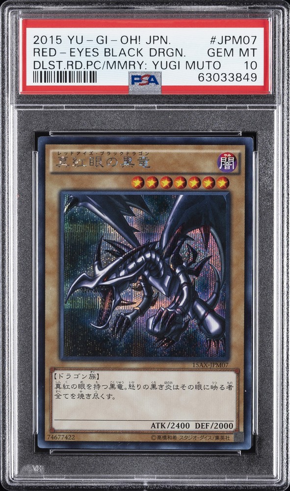 2015 YU-GI-OH! JAPANESE 15AX-DUELIST ROAD PIECE OF MEMORY SIDE: YUGI MUTO #JPM07 RED-EYES BLACK DRAGON PSA 10 2015 YU-GI-OH! JAPANESE 15AX-DUELIST ROAD PIECE OF MEMORY SIDE: YUGI MUTO #JPM07 RED-EYES BLACK DRAGON PSA 10 Purchase Info Thank you for your interest in this item consigned with PSA! By purchasing or making an offer on this item, you acknowledge and agree to the following terms: All sales are final. Returns not accepted. Payment must be made upon purchase of the item. All items are sold "as is" and without warranty of Collectors Universe, Inc. (d/b/a PSA), and ANY AND ALL IMPLIED WARRANTIES ARE DISCLAIMED AND EXCLUDED. Sales tax may apply depending on shipping address. PSA does not guarantee that another third-party grading company's authentication or certification of an item as genuine is correct or accurate. Neither a difference of opinion between third-party grading companies about authenticity, nor a company's subsequent reversal of its earlier authentication or certification of an item, will be a basis for rescinding a sale. Any dispute with another third-party grading company relating to the authenticity of an item must be resolved directly with that other company. Collectors' maximum liability in the event of loss or damage to an item during shipping will be the lesser of (a) the price paid for the item and (b) the change in fair market value of the item. You release Collectors from all other liability including for any claims of punitive damages, emotional distress, consequential damages, lost profits, or lost interest, except as prohibited by law. Shipping Purchased Items will be shipped directly from PSA Vault. You stay hands-free. PSA Vault When you purchase this item, you can save on sales tax and selling fees by keeping it in the PSA Vault, official Vault of eBay. Items already in PSA Vault and will be sent to PSA Vault will have no shipping charge Storage of any items with the PSA Vault will be subject to the PSA Vault Terms of Service. Consignment PSA has competitive rates on the world's largest collectibles marketplace with the option to list from the PSA Vault or immediately after PSA authentication and grading. Sale Price Under $100 $100 - $499 $500 - $999 $1,000 - $2,499 $2,500 - $4,999 $5,000+ Seller Fee 16% 14% 13% 10% 9% 7% Sellers pay a single fee as reflected above; no additional eBay fees are incurred. There is a $5 minimum fee on sold items.