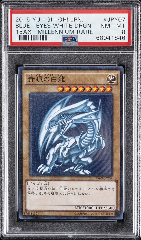 2015 YU-GI-OH! JAPANESE 15AX-DUELIST ROAD PIECE OF MEMORY SIDE: YAMI YUGI MILLENNIUM RARE #JPY07 BLUE-EYES WHITE DRAGON PSA 8 2015 YU-GI-OH! JAPANESE 15AX-DUELIST ROAD PIECE OF MEMORY SIDE: YAMI YUGI MILLENNIUM RARE #JPY07 BLUE-EYES WHITE DRAGON PSA 8 Purchase Info Thank you for your interest in this item consigned with PSA! By purchasing or making an offer on this item, you acknowledge and agree to the following terms: All sales are final. Returns not accepted. Payment must be made upon purchase of the item. All items are sold "as is" and without warranty of Collectors Universe, Inc. (d/b/a PSA), and ANY AND ALL IMPLIED WARRANTIES ARE DISCLAIMED AND EXCLUDED. Sales tax may apply depending on shipping address. PSA does not guarantee that another third-party grading company's authentication or certification of an item as genuine is correct or accurate. Neither a difference of opinion between third-party grading companies about authenticity, nor a company's subsequent reversal of its earlier authentication or certification of an item, will be a basis for rescinding a sale. Any dispute with another third-party grading company relating to the authenticity of an item must be resolved directly with that other company. Collectors' maximum liability in the event of loss or damage to an item during shipping will be the lesser of (a) the price paid for the item and (b) the change in fair market value of the item. You release Collectors from all other liability including for any claims of punitive damages, emotional distress, consequential damages, lost profits, or lost interest, except as prohibited by law. Shipping Purchased Items will be shipped directly from PSA Vault. You stay hands-free. PSA Vault When you purchase this item, you can save on sales tax and selling fees by keeping it in the PSA Vault, official Vault of eBay. Items already in PSA Vault and will be sent to PSA Vault will have no shipping charge Storage of any items with the PSA Vault will be subject to the PSA Vault Terms of Service. Consignment PSA has competitive rates on the world's largest collectibles marketplace with the option to list from the PSA Vault or immediately after PSA authentication and grading. Sale Price Under $100 $100 - $499 $500 - $999 $1,000 - $2,499 $2,500 - $4,999 $5,000+ Seller Fee 16% 14% 13% 10% 9% 7% Sellers pay a single fee as reflected above; no additional eBay fees are incurred. There is a $5 minimum fee on sold items.