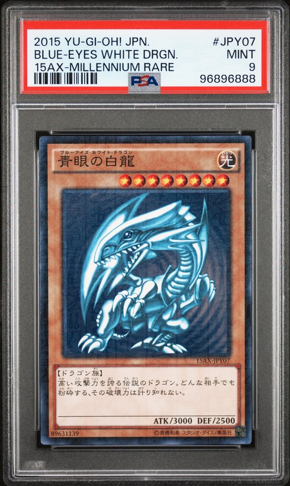 2015 YU-GI-OH! JAPANESE 15AX-DUELIST ROAD PIECE OF MEMORY SIDE: YAMI YUGI MILLENNIUM RARE #JPY07 BLUE-EYES WHITE DRAGON PSA 9 2015 YU-GI-OH! JAPANESE 15AX-DUELIST ROAD PIECE OF MEMORY SIDE: YAMI YUGI MILLENNIUM RARE #JPY07 BLUE-EYES WHITE DRAGON PSA 9 Purchase Info Thank you for your interest in this item consigned with PSA! By purchasing or making an offer on this item, you acknowledge and agree to the following terms: All sales are final. Returns not accepted. Payment must be made upon purchase of the item. All items are sold "as is" and without warranty of Collectors Universe, Inc. (d/b/a PSA), and ANY AND ALL IMPLIED WARRANTIES ARE DISCLAIMED AND EXCLUDED. Sales tax may apply depending on shipping address. PSA does not guarantee that another third-party grading company's authentication or certification of an item as genuine is correct or accurate. Neither a difference of opinion between third-party grading companies about authenticity, nor a company's subsequent reversal of its earlier authentication or certification of an item, will be a basis for rescinding a sale. Any dispute with another third-party grading company relating to the authenticity of an item must be resolved directly with that other company. Collectors' maximum liability in the event of loss or damage to an item during shipping will be the lesser of (a) the price paid for the item and (b) the change in fair market value of the item. You release Collectors from all other liability including for any claims of punitive damages, emotional distress, consequential damages, lost profits, or lost interest, except as prohibited by law. Shipping Purchased Items will be shipped directly from PSA Vault. You stay hands-free. PSA Vault When you purchase this item, you can save on sales tax and selling fees by keeping it in the PSA Vault, official Vault of eBay. Items already in PSA Vault and will be sent to PSA Vault will have no shipping charge Storage of any items with the PSA Vault will be subject to the PSA Vault Terms of Service. Consignment PSA has competitive rates on the world's largest collectibles marketplace with the option to list from the PSA Vault or immediately after PSA authentication and grading. Sale Price Under $100 $100 - $499 $500 - $999 $1,000 - $2,499 $2,500 - $4,999 $5,000+ Seller Fee 16% 14% 13% 10% 9% 7% Sellers pay a single fee as reflected above; no additional eBay fees are incurred. There is a $5 minimum fee on sold items.