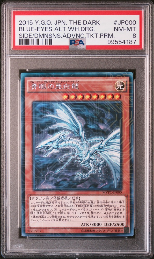 2015 YU-GI-OH! JAPANESE THE DARK SIDE OF DIMENSIONS ADVANCE TICKET PROMO #JP000 BLUE-EYES ALTERNATIVE WHITE DRAGON PSA 8 2015 YU-GI-OH! JAPANESE THE DARK SIDE OF DIMENSIONS ADVANCE TICKET PROMO #JP000 BLUE-EYES ALTERNATIVE WHITE DRAGON PSA 8 Purchase Info Thank you for your interest in this item consigned with PSA! By purchasing or making an offer on this item, you acknowledge and agree to the following terms: All sales are final. Returns not accepted. Payment must be made upon purchase of the item. All items are sold "as is" and without warranty of Collectors Universe, Inc. (d/b/a PSA), and ANY AND ALL IMPLIED WARRANTIES ARE DISCLAIMED AND EXCLUDED. Sales tax may apply depending on shipping address. PSA does not guarantee that another third-party grading company's authentication or certification of an item as genuine is correct or accurate. Neither a difference of opinion between third-party grading companies about authenticity, nor a company's subsequent reversal of its earlier authentication or certification of an item, will be a basis for rescinding a sale. Any dispute with another third-party grading company relating to the authenticity of an item must be resolved directly with that other company. Collectors' maximum liability in the event of loss or damage to an item during shipping will be the lesser of (a) the price paid for the item and (b) the change in fair market value of the item. You release Collectors from all other liability including for any claims of punitive damages, emotional distress, consequential damages, lost profits, or lost interest, except as prohibited by law. Shipping Purchased Items will be shipped directly from PSA Vault. You stay hands-free. PSA Vault When you purchase this item, you can save on sales tax and selling fees by keeping it in the PSA Vault, official Vault of eBay. Items already in PSA Vault and will be sent to PSA Vault will have no shipping charge Storage of any items with the PSA Vault will be subject to the PSA Vault Terms of Service. Consignment PSA has competitive rates on the world's largest collectibles marketplace with the option to list from the PSA Vault or immediately after PSA authentication and grading. Sale Price Under $100 $100 - $499 $500 - $999 $1,000 - $2,499 $2,500 - $4,999 $5,000+ Seller Fee 16% 14% 13% 10% 9% 7% Sellers pay a single fee as reflected above; no additional eBay fees are incurred. There is a $5 minimum fee on sold items.