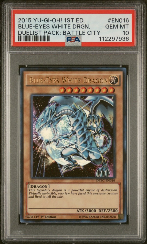 Elevate your Yu-Gi-Oh! TCG collection with the iconic Blue-Eyes White Dragon from the Duelist Pack Battle City set. This Ultra Rare card, bearing the number DPBC-EN016, boasts a holographic finish that captures the essence of its mythical power. As a first edition collectible, it represents a piece of trading card history, ideal for enthusiasts and serious collectors alike.Expertly preserved, the card is professionally graded as a PSA 10 Gem Mint, ensuring its top-notch quality. Released in 2015 by Konami, this English-language card features the legendary dragon in pristine detail, making it a must-have for any Yu-Gi-Oh! TCG connoisseur.