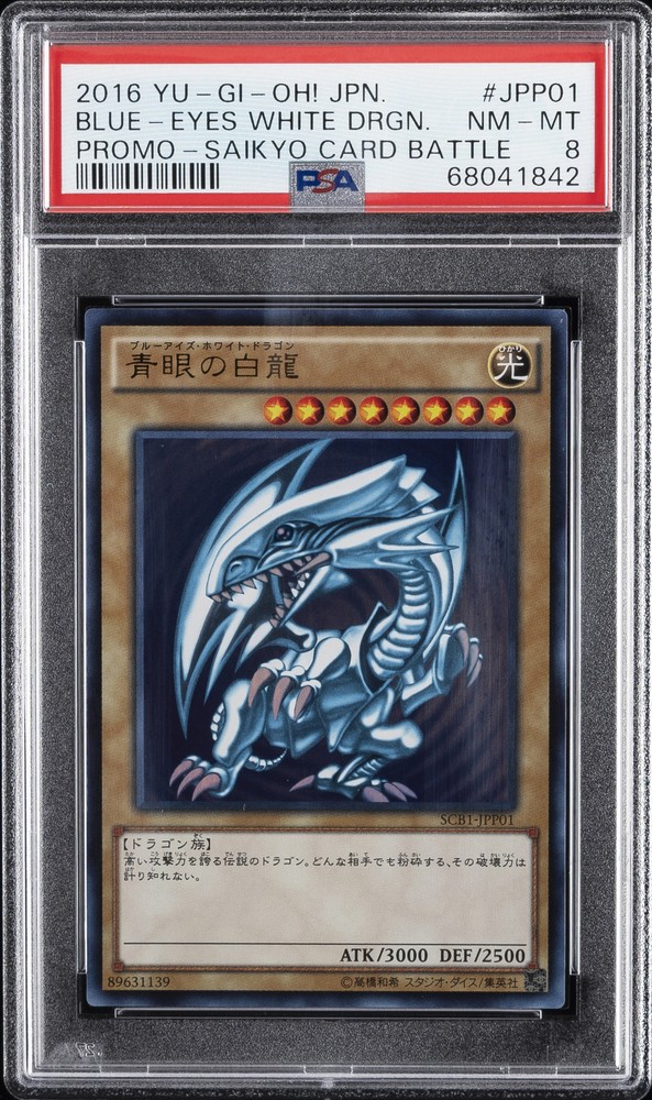 2016 YU-GI-OH! JAPANESE PROMO SAIKYO CARD BATTLE #JPP01 BLUE-EYES WHITE DRAGON PSA 8 2016 YU-GI-OH! JAPANESE PROMO SAIKYO CARD BATTLE #JPP01 BLUE-EYES WHITE DRAGON PSA 8 Purchase Info Thank you for your interest in this item consigned with PSA! By purchasing or making an offer on this item, you acknowledge and agree to the following terms: All sales are final. Returns not accepted. Payment must be made upon purchase of the item. All items are sold "as is" and without warranty of Collectors Universe, Inc. (d/b/a PSA), and ANY AND ALL IMPLIED WARRANTIES ARE DISCLAIMED AND EXCLUDED. Sales tax may apply depending on shipping address. PSA does not guarantee that another third-party grading company's authentication or certification of an item as genuine is correct or accurate. Neither a difference of opinion between third-party grading companies about authenticity, nor a company's subsequent reversal of its earlier authentication or certification of an item, will be a basis for rescinding a sale. Any dispute with another third-party grading company relating to the authenticity of an item must be resolved directly with that other company. Collectors' maximum liability in the event of loss or damage to an item during shipping will be the lesser of (a) the price paid for the item and (b) the change in fair market value of the item. You release Collectors from all other liability including for any claims of punitive damages, emotional distress, consequential damages, lost profits, or lost interest, except as prohibited by law. Shipping Purchased Items will be shipped directly from PSA Vault. You stay hands-free. PSA Vault When you purchase this item, you can save on sales tax and selling fees by keeping it in the PSA Vault, official Vault of eBay. Items already in PSA Vault and will be sent to PSA Vault will have no shipping charge Storage of any items with the PSA Vault will be subject to the PSA Vault Terms of Service. Consignment PSA has competitive rates on the world's largest collectibles marketplace with the option to list from the PSA Vault or immediately after PSA authentication and grading. Sale Price Under $100 $100 - $499 $500 - $999 $1,000 - $2,499 $2,500 - $4,999 $5,000+ Seller Fee 16% 14% 13% 10% 9% 7% Sellers pay a single fee as reflected above; no additional eBay fees are incurred. There is a $5 minimum fee on sold items.
