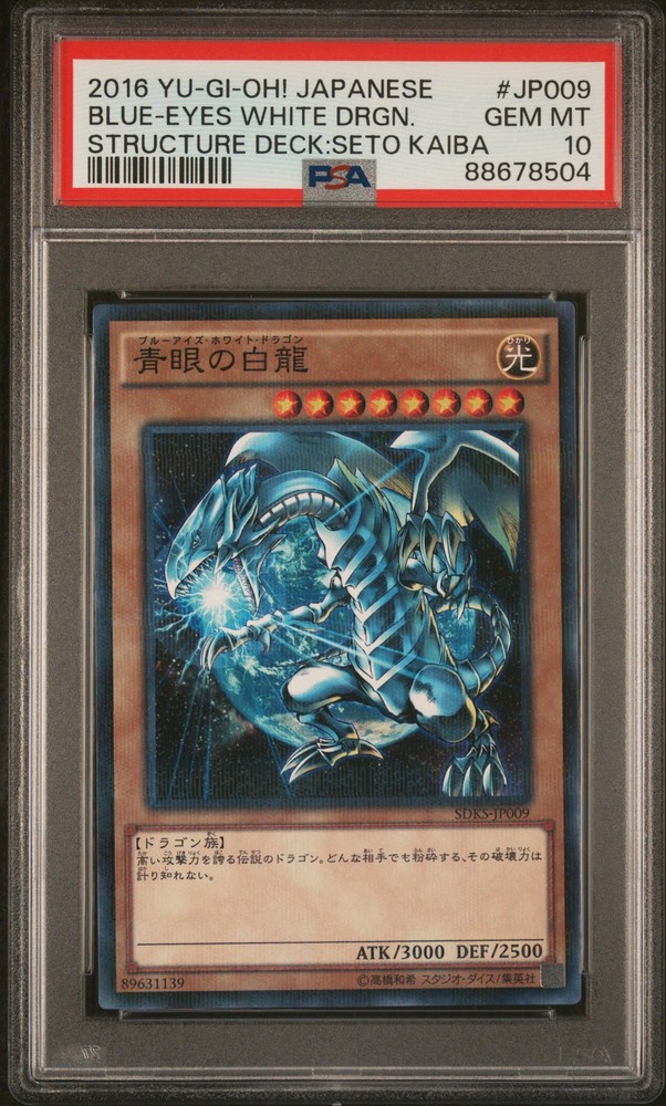 2016 YU-GI-OH! JAPANESE STRUCTURE DECK: SETO KAIBA #JP009 BLUE-EYES WHITE DRAGON PSA 10 2016 YU-GI-OH! JAPANESE STRUCTURE DECK: SETO KAIBA #JP009 BLUE-EYES WHITE DRAGON PSA 10 Purchase Info Thank you for your interest in this item consigned with PSA! By purchasing or making an offer on this item, you acknowledge and agree to the following terms: All sales are final. Returns not accepted. Payment must be made upon purchase of the item. All items are sold "as is" and without warranty of Collectors Universe, Inc. (d/b/a PSA), and ANY AND ALL IMPLIED WARRANTIES ARE DISCLAIMED AND EXCLUDED. Sales tax may apply depending on shipping address. PSA does not guarantee that another third-party grading company's authentication or certification of an item as genuine is correct or accurate. Neither a difference of opinion between third-party grading companies about authenticity, nor a company's subsequent reversal of its earlier authentication or certification of an item, will be a basis for rescinding a sale. Any dispute with another third-party grading company relating to the authenticity of an item must be resolved directly with that other company. Collectors' maximum liability in the event of loss or damage to an item during shipping will be the lesser of (a) the price paid for the item and (b) the change in fair market value of the item. You release Collectors from all other liability including for any claims of punitive damages, emotional distress, consequential damages, lost profits, or lost interest, except as prohibited by law. Shipping Purchased Items will be shipped directly from PSA Vault. You stay hands-free. PSA Vault When you purchase this item, you can save on sales tax and selling fees by keeping it in the PSA Vault, official Vault of eBay. Items already in PSA Vault and will be sent to PSA Vault will have no shipping charge Storage of any items with the PSA Vault will be subject to the PSA Vault Terms of Service. Consignment PSA has competitive rates on the world's largest collectibles marketplace with the option to list from the PSA Vault or immediately after PSA authentication and grading. Sale Price Under $100 $100 - $499 $500 - $999 $1,000 - $2,499 $2,500 - $4,999 $5,000+ Seller Fee 13% + $3 flat 13% 12% 10% 9% 7% Sellers pay a single fee as reflected above; no additional eBay fees are incurred.