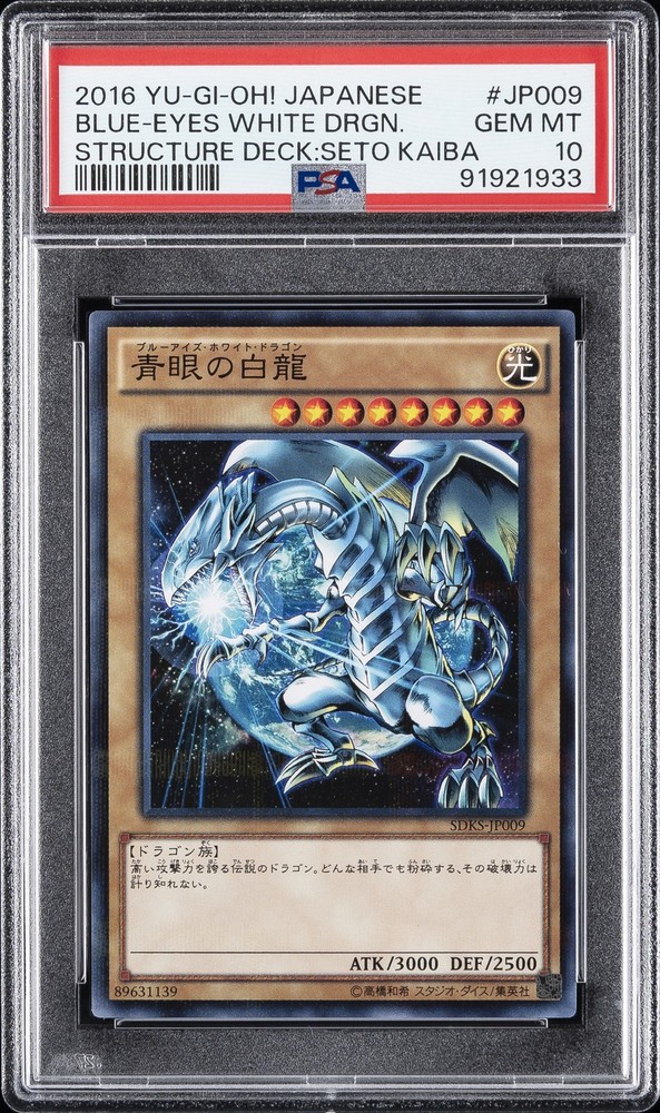 2016 YU-GI-OH! JAPANESE STRUCTURE DECK: SETO KAIBA #JP009 BLUE-EYES WHITE DRAGON PSA 10 2016 YU-GI-OH! JAPANESE STRUCTURE DECK: SETO KAIBA #JP009 BLUE-EYES WHITE DRAGON PSA 10 Purchase Info Thank you for your interest in bidding on this item consigned with PSA! By bidding on this item, you acknowledge and agree to the following terms: All sales are final. Returns not accepted. Payment must be made within 7 days of auction close. All items are sold "as is" and without warranty of Collectors Universe, Inc. (d/b/a PSA), and ANY AND ALL IMPLIED WARRANTIES ARE DISCLAIMED AND EXCLUDED. Sales tax may apply depending on shipping address. PSA does not guarantee that another third-party grading company's authentication or certification of an item as genuine is correct or accurate. Neither a difference of opinion between third-party grading companies about authenticity, nor a company's subsequent reversal of its earlier authentication or certification of an item, will be a basis for rescinding a sale. Any dispute with another third-party grading company relating to the authenticity of an item must be resolved directly with that other company. Collectors' maximum liability in the event of loss or damage to an item during shipping will be the lesser of (a) the price paid for the item and (b) the change in fair market value of the item. You release Collectors from all other liability including for any claims of punitive damages, emotional distress, consequential damages, lost profits, or lost interest, except as prohibited by law. Shipping Purchased Items will be shipped directly from PSA Vault. You stay hands-free. PSA Vault When you purchase this item, you can save on sales tax and selling fees by keeping it in the PSA Vault, official Vault of eBay. Items already in PSA Vault and will be sent to PSA Vault will have no shipping charge Storage of any items with the PSA Vault will be subject to the PSA Vault Terms of Service. Consignment PSA has competitive auction rates on the world's largest collectibles marketplace with the option to list from the PSA Vault or immediately after PSA authentication and grading. Sale Price Under $100 $100 - $499 $500 - $999 $1,000 - $2,499 $2,500 - $4,999 $5,000+ Seller Fee 13% + $3 flat 13% 12% 10% 9% 7% Sellers pay a single fee as reflected above; no additional eBay fees are incurred.