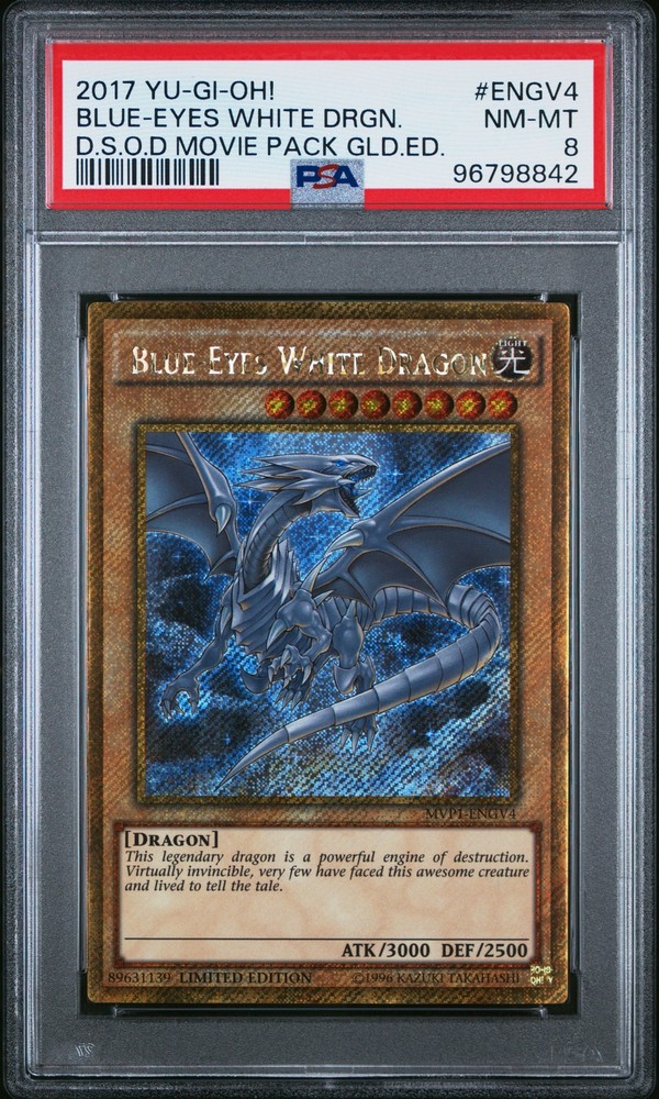 2017 YU-GI-OH! THE DARK SIDE OF DIMENSIONS MOVIE PACK GOLD EDITION #ENGV4 BLUE-EYES WHITE DRAGON PSA 8 2017 YU-GI-OH! THE DARK SIDE OF DIMENSIONS MOVIE PACK GOLD EDITION #ENGV4 BLUE-EYES WHITE DRAGON PSA 8 Purchase Info Thank you for your interest in this item consigned with PSA! By purchasing or making an offer on this item, you acknowledge and agree to the following terms: All sales are final. Returns not accepted. Payment must be made upon purchase of the item. All items are sold "as is" and without warranty of Collectors Universe, Inc. (d/b/a PSA), and ANY AND ALL IMPLIED WARRANTIES ARE DISCLAIMED AND EXCLUDED. Sales tax may apply depending on shipping address. PSA does not guarantee that another third-party grading company's authentication or certification of an item as genuine is correct or accurate. Neither a difference of opinion between third-party grading companies about authenticity, nor a company's subsequent reversal of its earlier authentication or certification of an item, will be a basis for rescinding a sale. Any dispute with another third-party grading company relating to the authenticity of an item must be resolved directly with that other company. Collectors' maximum liability in the event of loss or damage to an item during shipping will be the lesser of (a) the price paid for the item and (b) the change in fair market value of the item. You release Collectors from all other liability including for any claims of punitive damages, emotional distress, consequential damages, lost profits, or lost interest, except as prohibited by law. Shipping Purchased Items will be shipped directly from PSA Vault. You stay hands-free. PSA Vault When you purchase this item, you can save on sales tax and selling fees by keeping it in the PSA Vault, official Vault of eBay. Items already in PSA Vault and will be sent to PSA Vault will have no shipping charge Storage of any items with the PSA Vault will be subject to the PSA Vault Terms of Service. Consignment PSA has competitive rates on the world's largest collectibles marketplace with the option to list from the PSA Vault or immediately after PSA authentication and grading. Sale Price Under $100 $100 - $499 $500 - $999 $1,000 - $2,499 $2,500 - $4,999 $5,000+ Seller Fee 16% 14% 13% 10% 9% 7% Sellers pay a single fee as reflected above; no additional eBay fees are incurred. There is a $5 minimum fee on sold items.