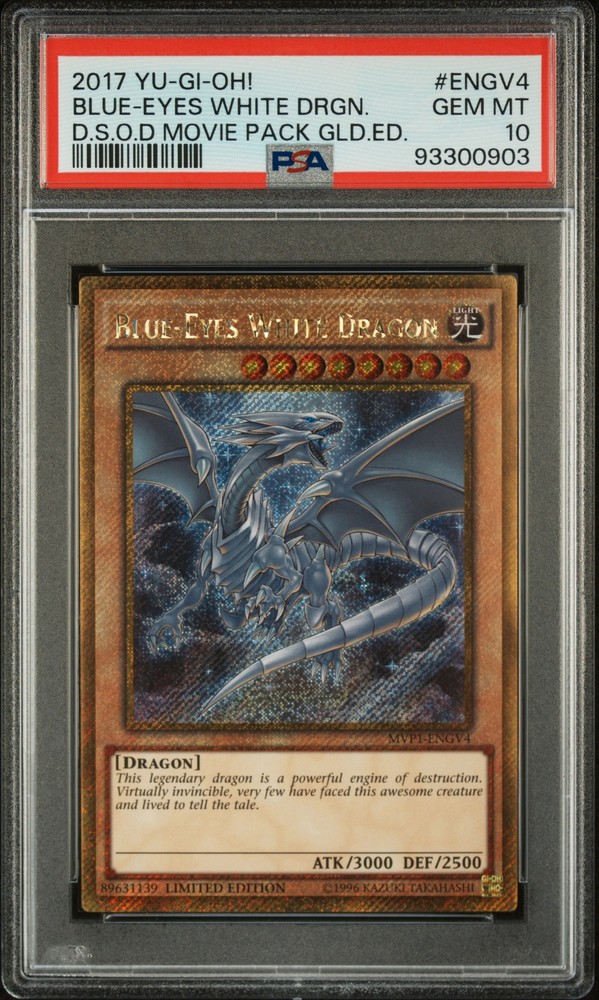 2017 YU-GI-OH! THE DARK SIDE OF DIMENSIONS MOVIE PACK GOLD EDITION #ENGV4 BLUE-EYES WHITE DRAGON PSA 10 2017 YU-GI-OH! THE DARK SIDE OF DIMENSIONS MOVIE PACK GOLD EDITION #ENGV4 BLUE-EYES WHITE DRAGON PSA 10 Purchase Info Thank you for your interest in this item consigned with PSA! By purchasing or making an offer on this item, you acknowledge and agree to the following terms: All sales are final. Returns not accepted. Payment must be made upon purchase of the item. All items are sold "as is" and without warranty of Collectors Universe, Inc. (d/b/a PSA), and ANY AND ALL IMPLIED WARRANTIES ARE DISCLAIMED AND EXCLUDED. Sales tax may apply depending on shipping address. PSA does not guarantee that another third-party grading company's authentication or certification of an item as genuine is correct or accurate. Neither a difference of opinion between third-party grading companies about authenticity, nor a company's subsequent reversal of its earlier authentication or certification of an item, will be a basis for rescinding a sale. Any dispute with another third-party grading company relating to the authenticity of an item must be resolved directly with that other company. Collectors' maximum liability in the event of loss or damage to an item during shipping will be the lesser of (a) the price paid for the item and (b) the change in fair market value of the item. You release Collectors from all other liability including for any claims of punitive damages, emotional distress, consequential damages, lost profits, or lost interest, except as prohibited by law. Shipping Purchased Items will be shipped directly from PSA Vault. You stay hands-free. PSA Vault When you purchase this item, you can save on sales tax and selling fees by keeping it in the PSA Vault, official Vault of eBay. Items already in PSA Vault and will be sent to PSA Vault will have no shipping charge Storage of any items with the PSA Vault will be subject to the PSA Vault Terms of Service. Consignment PSA has competitive rates on the world's largest collectibles marketplace with the option to list from the PSA Vault or immediately after PSA authentication and grading. Sale Price Under $100 $100 - $499 $500 - $999 $1,000 - $2,499 $2,500 - $4,999 $5,000+ Seller Fee 16% 14% 13% 10% 9% 7% Sellers pay a single fee as reflected above; no additional eBay fees are incurred. There is a $5 minimum fee on sold items.