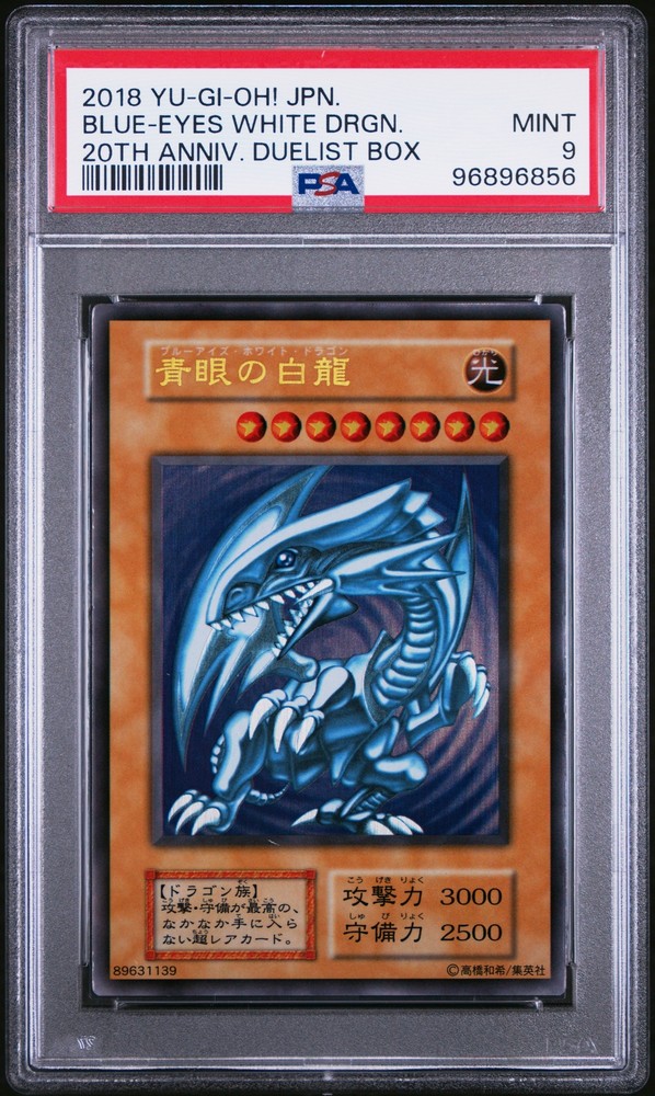 2018 YU-GI-OH! JAPANESE 20TH-20TH ANNIVERSARY DUELIST BOX BLUE-EYES WHITE DRAGON PSA 9 2018 YU-GI-OH! JAPANESE 20TH-20TH ANNIVERSARY DUELIST BOX BLUE-EYES WHITE DRAGON PSA 9 Purchase Info Thank you for your interest in this item consigned with PSA! By purchasing or making an offer on this item, you acknowledge and agree to the following terms: All sales are final. Returns not accepted. Payment must be made upon purchase of the item. All items are sold "as is" and without warranty of Collectors Universe, Inc. (d/b/a PSA), and ANY AND ALL IMPLIED WARRANTIES ARE DISCLAIMED AND EXCLUDED. Sales tax may apply depending on shipping address. PSA does not guarantee that another third-party grading company's authentication or certification of an item as genuine is correct or accurate. Neither a difference of opinion between third-party grading companies about authenticity, nor a company's subsequent reversal of its earlier authentication or certification of an item, will be a basis for rescinding a sale. Any dispute with another third-party grading company relating to the authenticity of an item must be resolved directly with that other company. Collectors' maximum liability in the event of loss or damage to an item during shipping will be the lesser of (a) the price paid for the item and (b) the change in fair market value of the item. You release Collectors from all other liability including for any claims of punitive damages, emotional distress, consequential damages, lost profits, or lost interest, except as prohibited by law. Shipping Purchased Items will be shipped directly from PSA Vault. You stay hands-free. PSA Vault When you purchase this item, you can save on sales tax and selling fees by keeping it in the PSA Vault, official Vault of eBay. Items already in PSA Vault and will be sent to PSA Vault will have no shipping charge Storage of any items with the PSA Vault will be subject to the PSA Vault Terms of Service. Consignment PSA has competitive rates on the world's largest collectibles marketplace with the option to list from the PSA Vault or immediately after PSA authentication and grading. Sale Price Under $100 $100 - $499 $500 - $999 $1,000 - $2,499 $2,500 - $4,999 $5,000+ Seller Fee 16% 14% 13% 10% 9% 7% Sellers pay a single fee as reflected above; no additional eBay fees are incurred. There is a $5 minimum fee on sold items.