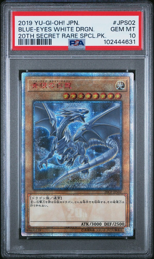 2019 YU-GI-OH! JAPANESE 20TH SECRET RARE SPECIAL PACK #JPS02 BLUE-EYES WHITE DRAGON PSA 10 2019 YU-GI-OH! JAPANESE 20TH SECRET RARE SPECIAL PACK #JPS02 BLUE-EYES WHITE DRAGON PSA 10 Purchase Info Thank you for your interest in this item consigned with PSA! By purchasing or making an offer on this item, you acknowledge and agree to the following terms: All sales are final. Returns not accepted. Payment must be made upon purchase of the item. All items are sold "as is" and without warranty of Collectors Universe, Inc. (d/b/a PSA), and ANY AND ALL IMPLIED WARRANTIES ARE DISCLAIMED AND EXCLUDED. Sales tax may apply depending on shipping address. PSA does not guarantee that another third-party grading company's authentication or certification of an item as genuine is correct or accurate. Neither a difference of opinion between third-party grading companies about authenticity, nor a company's subsequent reversal of its earlier authentication or certification of an item, will be a basis for rescinding a sale. Any dispute with another third-party grading company relating to the authenticity of an item must be resolved directly with that other company. Collectors' maximum liability in the event of loss or damage to an item during shipping will be the lesser of (a) the price paid for the item and (b) the change in fair market value of the item. You release Collectors from all other liability including for any claims of punitive damages, emotional distress, consequential damages, lost profits, or lost interest, except as prohibited by law. Shipping Purchased Items will be shipped directly from PSA Vault. You stay hands-free. PSA Vault When you purchase this item, you can save on sales tax and selling fees by keeping it in the PSA Vault, official Vault of eBay. Items already in PSA Vault and will be sent to PSA Vault will have no shipping charge Storage of any items with the PSA Vault will be subject to the PSA Vault Terms of Service. Consignment PSA has competitive rates on the world's largest collectibles marketplace with the option to list from the PSA Vault or immediately after PSA authentication and grading. Sale Price Under $100 $100 - $499 $500 - $999 $1,000 - $2,499 $2,500 - $4,999 $5,000+ Seller Fee 16% 14% 13% 10% 9% 7% Sellers pay a single fee as reflected above; no additional eBay fees are incurred. There is a $5 minimum fee on sold items.