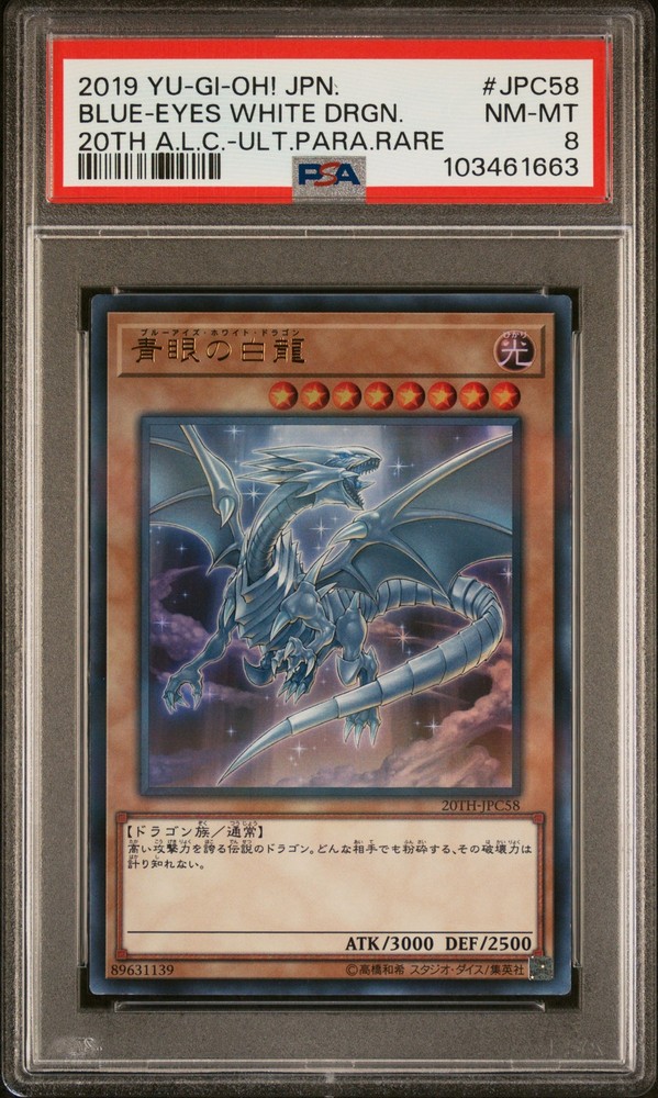2019 YU-GI-OH! JAPANESE 20TH-20TH ANNIVERSARY LEGEND COLLECTION ULTRA PARALLEL RARE #JPC58 BLUE-EYES WHITE DRAGON PSA 8 2019 YU-GI-OH! JAPANESE 20TH-20TH ANNIVERSARY LEGEND COLLECTION ULTRA PARALLEL RARE #JPC58 BLUE-EYES WHITE DRAGON PSA 8 Purchase Info Thank you for your interest in this item consigned with PSA! By purchasing or making an offer on this item, you acknowledge and agree to the following terms: All sales are final. Returns not accepted. Payment must be made upon purchase of the item. All items are sold "as is" and without warranty of Collectors Universe, Inc. (d/b/a PSA), and ANY AND ALL IMPLIED WARRANTIES ARE DISCLAIMED AND EXCLUDED. Sales tax may apply depending on shipping address. PSA does not guarantee that another third-party grading company's authentication or certification of an item as genuine is correct or accurate. Neither a difference of opinion between third-party grading companies about authenticity, nor a company's subsequent reversal of its earlier authentication or certification of an item, will be a basis for rescinding a sale. Any dispute with another third-party grading company relating to the authenticity of an item must be resolved directly with that other company. Collectors' maximum liability in the event of loss or damage to an item during shipping will be the lesser of (a) the price paid for the item and (b) the change in fair market value of the item. You release Collectors from all other liability including for any claims of punitive damages, emotional distress, consequential damages, lost profits, or lost interest, except as prohibited by law. Shipping Purchased Items will be shipped directly from PSA Vault. You stay hands-free. PSA Vault When you purchase this item, you can save on sales tax and selling fees by keeping it in the PSA Vault, official Vault of eBay. Items already in PSA Vault and will be sent to PSA Vault will have no shipping charge Storage of any items with the PSA Vault will be subject to the PSA Vault Terms of Service. Consignment PSA has competitive rates on the world's largest collectibles marketplace with the option to list from the PSA Vault or immediately after PSA authentication and grading. Sale Price Under $100 $100 - $499 $500 - $999 $1,000 - $2,499 $2,500 - $4,999 $5,000+ Seller Fee 16% 14% 13% 10% 9% 7% Sellers pay a single fee as reflected above; no additional eBay fees are incurred. There is a $5 minimum fee on sold items.