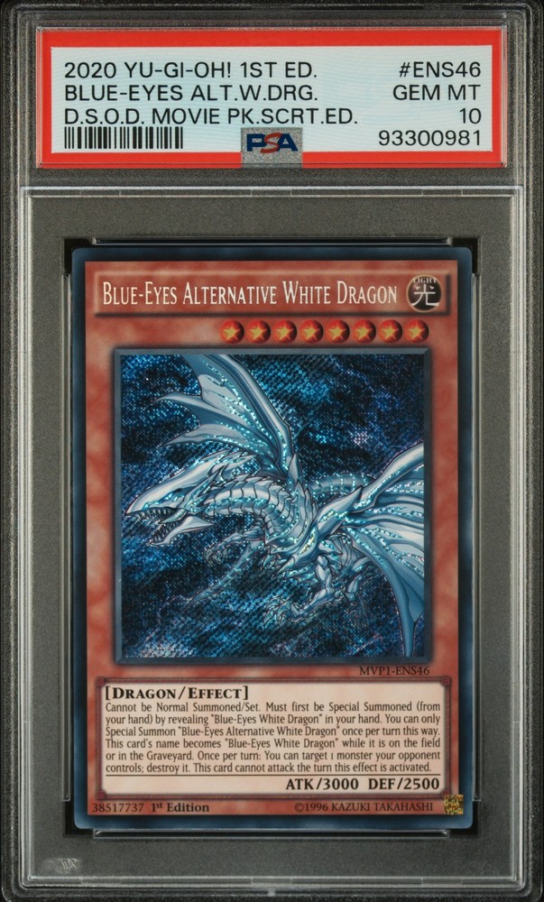 2020 YU-GI-OH! THE DARK SIDE OF DIMENSIONS MOVIE PACK SECRET EDITION 1ST EDITION #ENS46 BLUE-EYES ALTERNATIVE WHITE DRAGON PSA 10 2020 YU-GI-OH! THE DARK SIDE OF DIMENSIONS MOVIE PACK SECRET EDITION 1ST EDITION #ENS46 BLUE-EYES ALTERNATIVE WHITE DRAGON PSA 10 Purchase Info Thank you for your interest in this item consigned with PSA! By purchasing or making an offer on this item, you acknowledge and agree to the following terms: All sales are final. Returns not accepted. Payment must be made upon purchase of the item. All items are sold "as is" and without warranty of Collectors Universe, Inc. (d/b/a PSA), and ANY AND ALL IMPLIED WARRANTIES ARE DISCLAIMED AND EXCLUDED. Sales tax may apply depending on shipping address. PSA does not guarantee that another third-party grading company's authentication or certification of an item as genuine is correct or accurate. Neither a difference of opinion between third-party grading companies about authenticity, nor a company's subsequent reversal of its earlier authentication or certification of an item, will be a basis for rescinding a sale. Any dispute with another third-party grading company relating to the authenticity of an item must be resolved directly with that other company. Collectors' maximum liability in the event of loss or damage to an item during shipping will be the lesser of (a) the price paid for the item and (b) the change in fair market value of the item. You release Collectors from all other liability including for any claims of punitive damages, emotional distress, consequential damages, lost profits, or lost interest, except as prohibited by law. Shipping Purchased Items will be shipped directly from PSA Vault. You stay hands-free. PSA Vault When you purchase this item, you can save on sales tax and selling fees by keeping it in the PSA Vault, official Vault of eBay. Items already in PSA Vault and will be sent to PSA Vault will have no shipping charge Storage of any items with the PSA Vault will be subject to the PSA Vault Terms of Service. Consignment PSA has competitive rates on the world's largest collectibles marketplace with the option to list from the PSA Vault or immediately after PSA authentication and grading. Sale Price Under $100 $100 - $499 $500 - $999 $1,000 - $2,499 $2,500 - $4,999 $5,000+ Seller Fee 16% 14% 13% 10% 9% 7% Sellers pay a single fee as reflected above; no additional eBay fees are incurred. There is a $5 minimum fee on sold items.