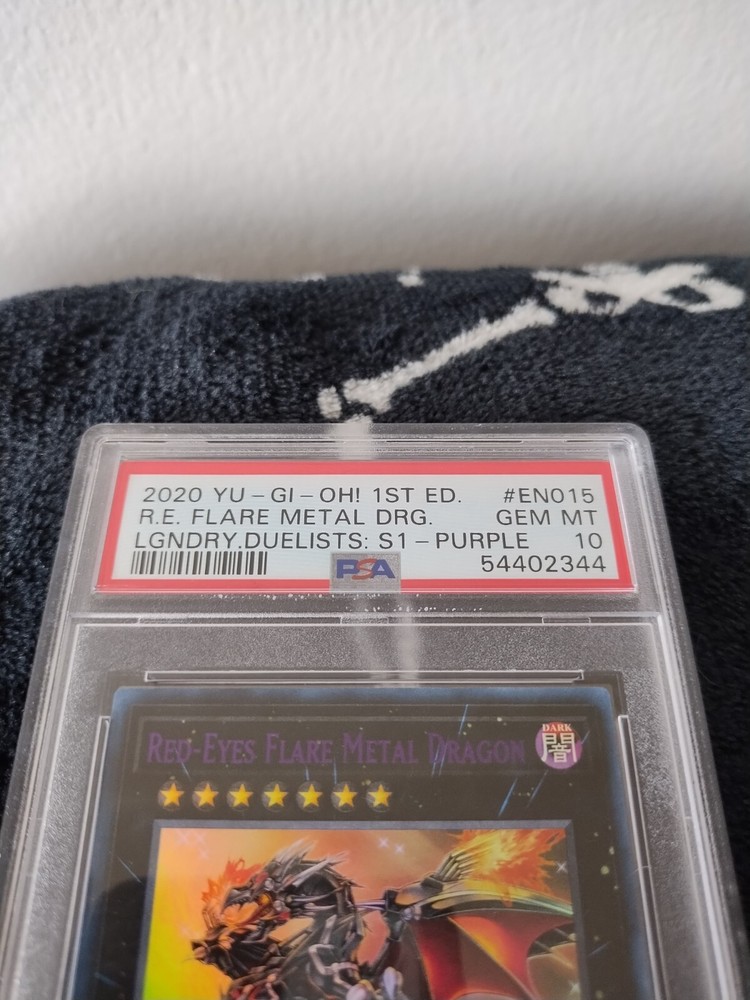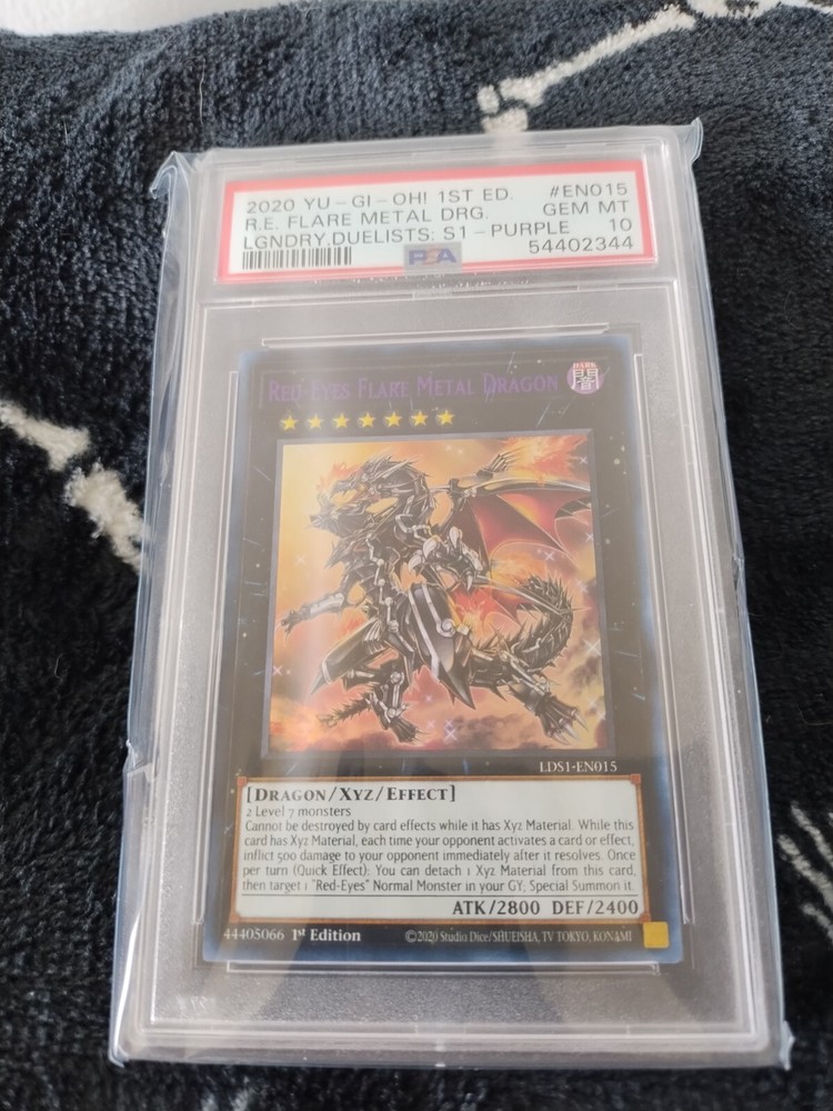 This is a rare and highly sought-after card from the 2020 PSA 10 YUGIOH LDS1 RED EYES PURPLE ULTRA RARE FLARE METAL DRAGON set. The card features a Darkness attribute and GX speciality, with a Dragon creature/monster type and Ultimate stage. It is made of high-quality card stock material and has a holographic finish. The card is in English language and manufactured by Konami, a renowned name in the Yu-Gi-Oh! TCG game. It is suitable for ages 8 and up and is a 1st edition card. This card is perfect for collectors and enthusiasts of the game alike.