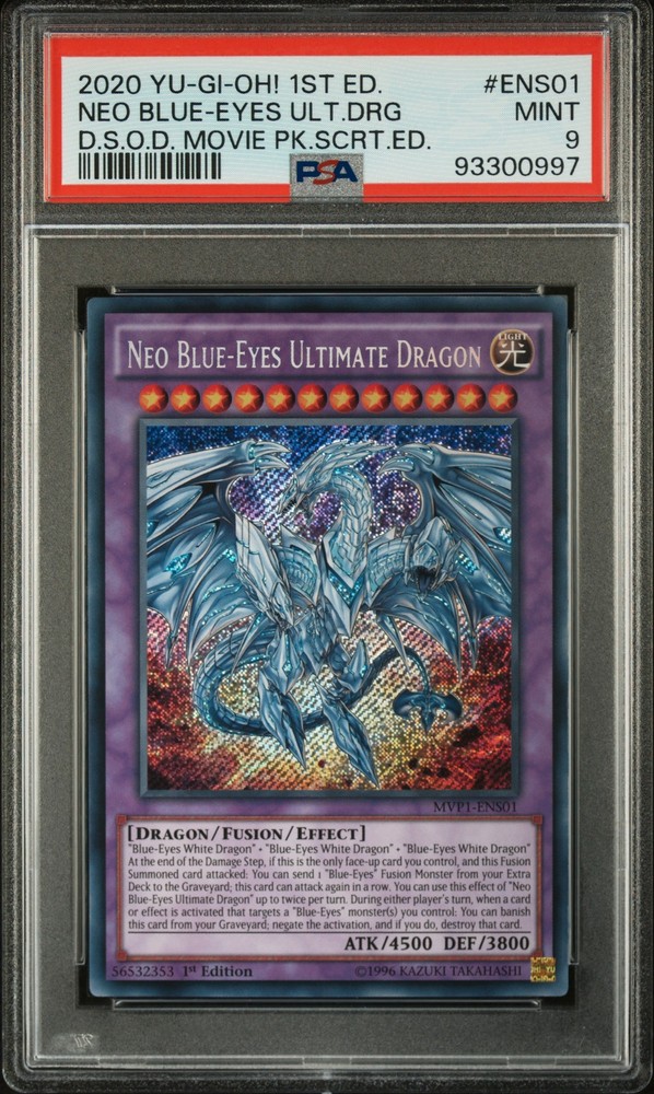2020 YU-GI-OH! THE DARK SIDE OF DIMENSIONS MOVIE PACK SECRET EDITION 1ST EDITION #ENS01 NEO BLUE-EYES ULTIMATE DRAGON PSA 9 2020 YU-GI-OH! THE DARK SIDE OF DIMENSIONS MOVIE PACK SECRET EDITION 1ST EDITION #ENS01 NEO BLUE-EYES ULTIMATE DRAGON PSA 9 Purchase Info Thank you for your interest in this item consigned with PSA! By purchasing or making an offer on this item, you acknowledge and agree to the following terms: All sales are final. Returns not accepted. Payment must be made upon purchase of the item. All items are sold "as is" and without warranty of Collectors Universe, Inc. (d/b/a PSA), and ANY AND ALL IMPLIED WARRANTIES ARE DISCLAIMED AND EXCLUDED. Sales tax may apply depending on shipping address. PSA does not guarantee that another third-party grading company's authentication or certification of an item as genuine is correct or accurate. Neither a difference of opinion between third-party grading companies about authenticity, nor a company's subsequent reversal of its earlier authentication or certification of an item, will be a basis for rescinding a sale. Any dispute with another third-party grading company relating to the authenticity of an item must be resolved directly with that other company. Collectors' maximum liability in the event of loss or damage to an item during shipping will be the lesser of (a) the price paid for the item and (b) the change in fair market value of the item. You release Collectors from all other liability including for any claims of punitive damages, emotional distress, consequential damages, lost profits, or lost interest, except as prohibited by law. Shipping Purchased Items will be shipped directly from PSA Vault. You stay hands-free. PSA Vault When you purchase this item, you can save on sales tax and selling fees by keeping it in the PSA Vault, official Vault of eBay. Items already in PSA Vault and will be sent to PSA Vault will have no shipping charge Storage of any items with the PSA Vault will be subject to the PSA Vault Terms of Service. Consignment PSA has competitive rates on the world's largest collectibles marketplace with the option to list from the PSA Vault or immediately after PSA authentication and grading. Sale Price Under $100 $100 - $499 $500 - $999 $1,000 - $2,499 $2,500 - $4,999 $5,000+ Seller Fee 16% 14% 13% 10% 9% 7% Sellers pay a single fee as reflected above; no additional eBay fees are incurred. There is a $5 minimum fee on sold items.