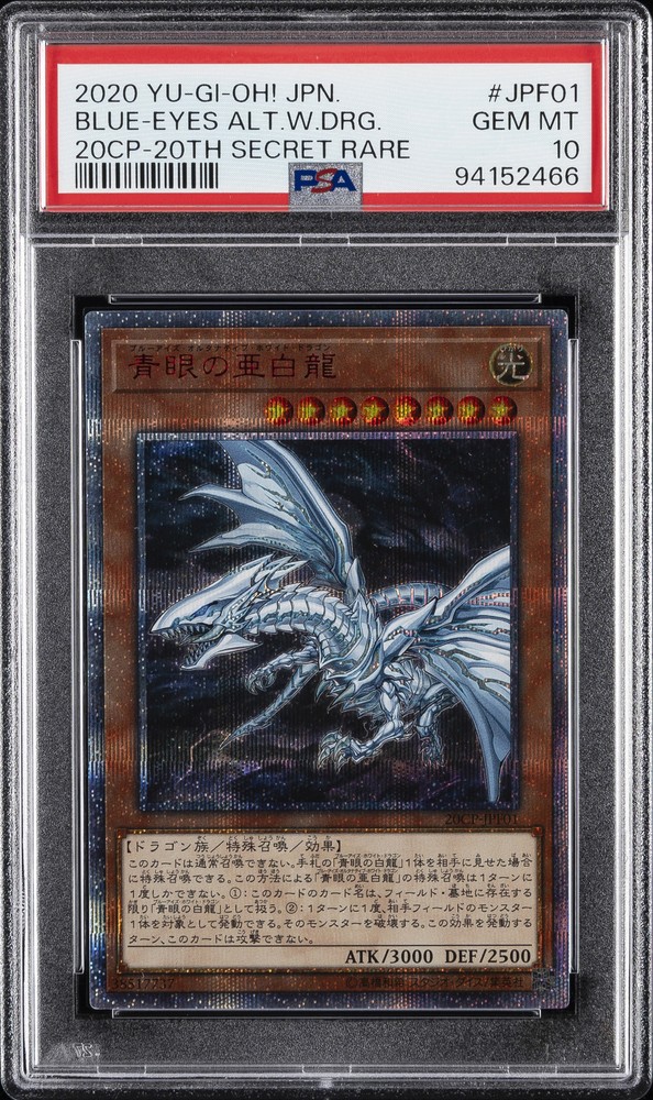 2020 YU-GI-OH! JAPANESE 20CP-20TH SECRET RARE FINAL CHALLENGE PACK 20TH SECRET RARE #JPF01 BLUE-EYES ALTERNATIVE WHITE DRAGON PSA 10 2020 YU-GI-OH! JAPANESE 20CP-20TH SECRET RARE FINAL CHALLENGE PACK 20TH SECRET RARE #JPF01 BLUE-EYES ALTERNATIVE WHITE DRAGON PSA 10 Purchase Info Thank you for your interest in this item consigned with PSA! By purchasing or making an offer on this item, you acknowledge and agree to the following terms: All sales are final. Returns not accepted. Payment must be made upon purchase of the item. All items are sold "as is" and without warranty of Collectors Universe, Inc. (d/b/a PSA), and ANY AND ALL IMPLIED WARRANTIES ARE DISCLAIMED AND EXCLUDED. Sales tax may apply depending on shipping address. PSA does not guarantee that another third-party grading company's authentication or certification of an item as genuine is correct or accurate. Neither a difference of opinion between third-party grading companies about authenticity, nor a company's subsequent reversal of its earlier authentication or certification of an item, will be a basis for rescinding a sale. Any dispute with another third-party grading company relating to the authenticity of an item must be resolved directly with that other company. Collectors' maximum liability in the event of loss or damage to an item during shipping will be the lesser of (a) the price paid for the item and (b) the change in fair market value of the item. You release Collectors from all other liability including for any claims of punitive damages, emotional distress, consequential damages, lost profits, or lost interest, except as prohibited by law. Shipping Purchased Items will be shipped directly from PSA Vault. You stay hands-free. PSA Vault When you purchase this item, you can save on sales tax and selling fees by keeping it in the PSA Vault, official Vault of eBay. Items already in PSA Vault and will be sent to PSA Vault will have no shipping charge Storage of any items with the PSA Vault will be subject to the PSA Vault Terms of Service. Consignment PSA has competitive rates on the world's largest collectibles marketplace with the option to list from the PSA Vault or immediately after PSA authentication and grading. Sale Price Under $100 $100 - $499 $500 - $999 $1,000 - $2,499 $2,500 - $4,999 $5,000+ Seller Fee 16% 14% 13% 10% 9% 7% Sellers pay a single fee as reflected above; no additional eBay fees are incurred. There is a $5 minimum fee on sold items.