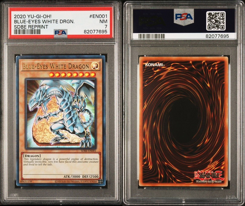 Summon the power of the Blue Eyes White Dragon with this legendary Yu-Gi-Oh! TCG card. The 2020 reprint features stunning holographic finish and is graded PSA 7 NMINT. The card belongs to the - Yugi - set and has the rarity of Legendary. This card unleashes a dragon attack with its Creature/Monster Type, DRAGON. The card name is Blue Eyes White Dragon and it features the manufacturer Yu-Gi-Oh. It is a perfect addition to any collection and is a must-have for fans of the game.
