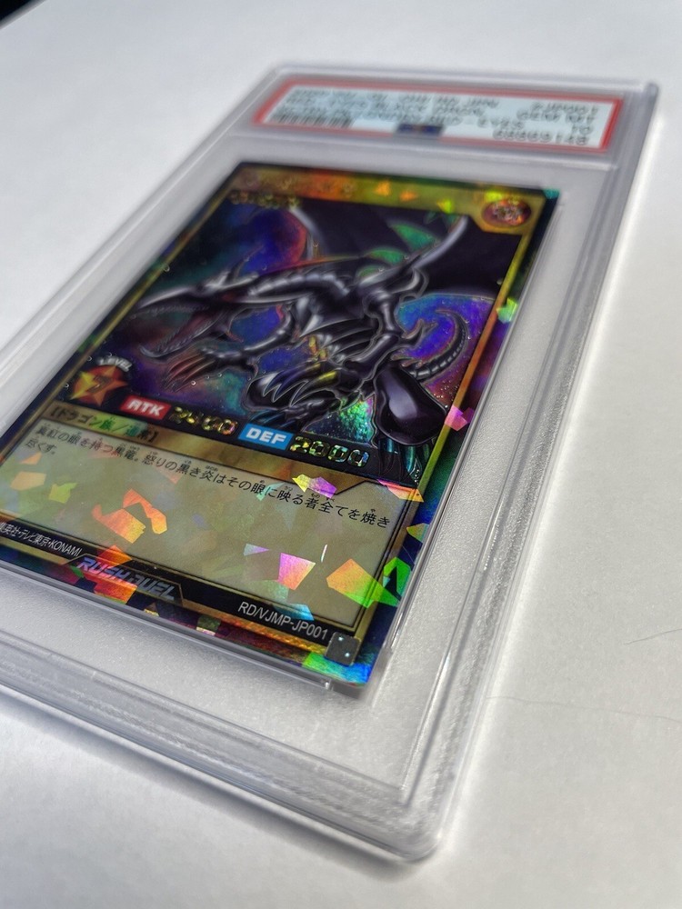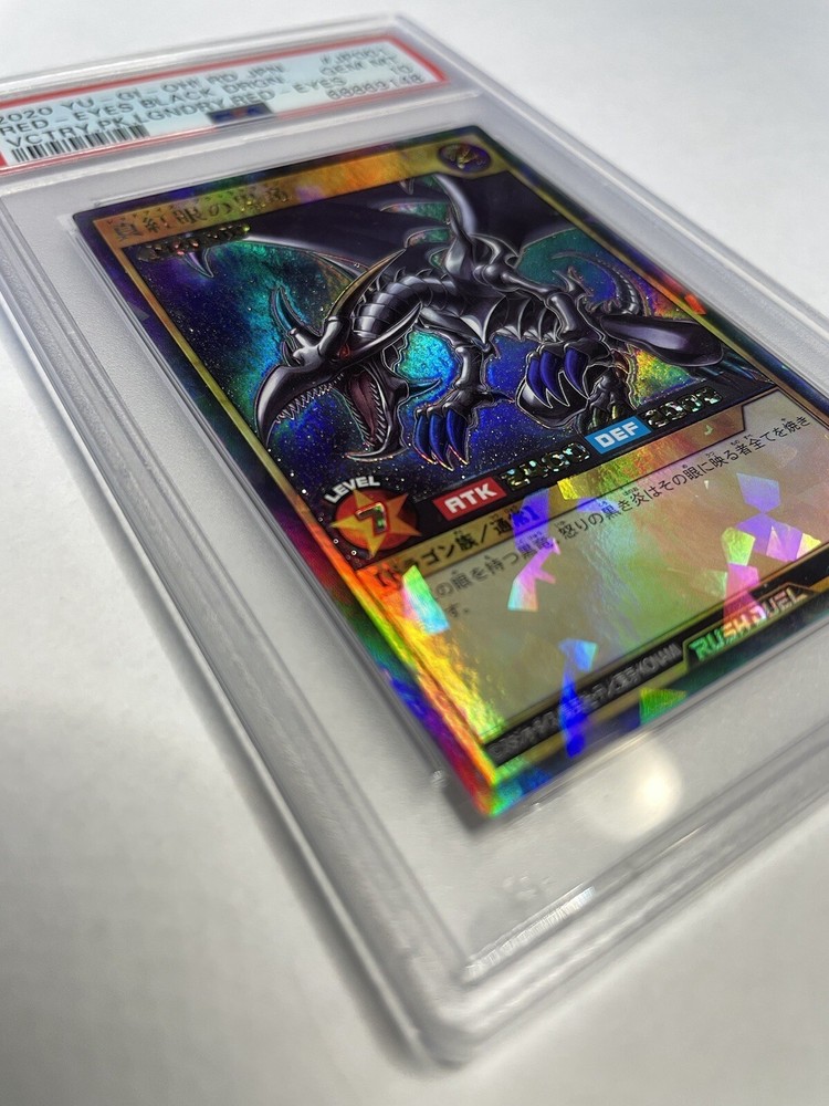 This is a 2020 Yu-Gi-Oh! TCG Red-Eyes Black Dragon card, featuring the dragon creature type. The card is a collectors edition from the Victory Pack Legendary Red-Eyes set, with a Rarity of Rush Rare and a Grade of 10 from the Professional Sports Authenticator (PSA). The card is in Japanese language, with a Card Number of RD/VJMP-JP001 and a Foil finish. The card is made of paperboard material, and has not been autographed. It is a standard size card and was manufactured in Japan in 2020. The certification number for this card is 68869148. This is a great addition to any Yu-Gi-Oh! card collection.
