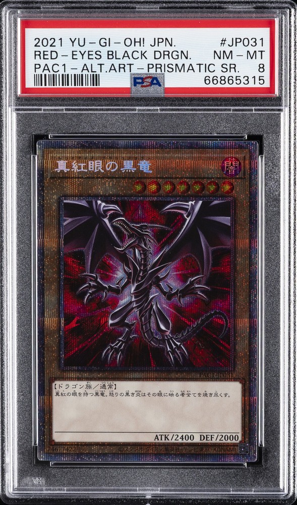 2021 YU-GI-OH! JAPANESE PAC1-PRISMATIC ART COLLECTION ALTERNATE ART-PRISMATIC SECRET RARE #JP031 RED-EYES BLACK DRAGON PSA 8 2021 YU-GI-OH! JAPANESE PAC1-PRISMATIC ART COLLECTION ALTERNATE ART-PRISMATIC SECRET RARE #JP031 RED-EYES BLACK DRAGON PSA 8 Purchase Info Thank you for your interest in bidding on this item consigned with PSA! By bidding on this item, you acknowledge and agree to the following terms: All sales are final. Returns not accepted. Payment must be made within 7 days of auction close. All items are sold "as is" and without warranty of Collectors Universe, Inc. (d/b/a PSA), and ANY AND ALL IMPLIED WARRANTIES ARE DISCLAIMED AND EXCLUDED. Sales tax may apply depending on shipping address. PSA does not guarantee that another third-party grading company's authentication or certification of an item as genuine is correct or accurate. Neither a difference of opinion between third-party grading companies about authenticity, nor a company's subsequent reversal of its earlier authentication or certification of an item, will be a basis for rescinding a sale. Any dispute with another third-party grading company relating to the authenticity of an item must be resolved directly with that other company. Collectors' maximum liability in the event of loss or damage to an item during shipping will be the lesser of (a) the price paid for the item and (b) the change in fair market value of the item. You release Collectors from all other liability including for any claims of punitive damages, emotional distress, consequential damages, lost profits, or lost interest, except as prohibited by law. Shipping Purchased Items will be shipped directly from PSA Vault. You stay hands-free. PSA Vault When you purchase this item, you can save on sales tax and selling fees by keeping it in the PSA Vault, official Vault of eBay. Items already in PSA Vault and will be sent to PSA Vault will have no shipping charge Storage of any items with the PSA Vault will be subject to the PSA Vault Terms of Service. Consignment PSA has competitive auction rates on the world's largest collectibles marketplace with the option to list from the PSA Vault or immediately after PSA authentication and grading. Sale Price Under $100 $100 - $499 $500 - $999 $1,000 - $2,499 $2,500 - $4,999 $5,000+ Seller Fee 13% + $3 flat 13% 12% 10% 9% 7% Sellers pay a single fee as reflected above; no additional eBay fees are incurred.