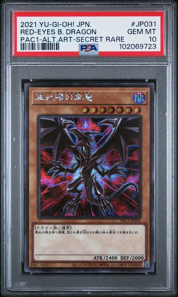 This 2021 Yu-Gi-Oh! Japanese Pacific Prismmatic Art Collection card features the iconic Red-Eyes Black Dragon in a stunning alternate art design. This secret rare card is highly sought after by collectors and players alike, and is sure to make a powerful addition to any deck. With a card number of JP031, this Red-Eyes Black Dragon card is a must-have for any serious Yu-Gi-Oh! TCG collector. Perfect for display or for use in gameplay, this card is sure to impress. Don't miss your chance to add this powerful monster to your collection.