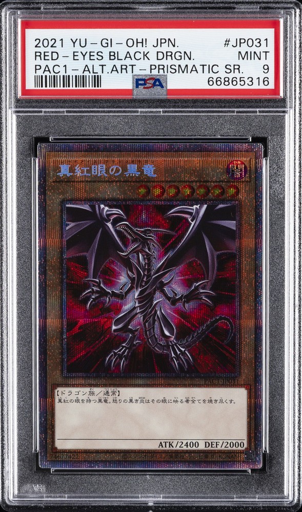 2021 YU-GI-OH! JAPANESE PAC1-PRISMATIC ART COLLECTION ALTERNATE ART-PRISMATIC SECRET RARE #JP031 RED-EYES BLACK DRAGON PSA 9 2021 YU-GI-OH! JAPANESE PAC1-PRISMATIC ART COLLECTION ALTERNATE ART-PRISMATIC SECRET RARE #JP031 RED-EYES BLACK DRAGON PSA 9 Purchase Info Thank you for your interest in bidding on this item consigned with PSA! By bidding on this item, you acknowledge and agree to the following terms: All sales are final. Returns not accepted. Payment must be made within 7 days of auction close. All items are sold "as is" and without warranty of Collectors Universe, Inc. (d/b/a PSA), and ANY AND ALL IMPLIED WARRANTIES ARE DISCLAIMED AND EXCLUDED. Sales tax may apply depending on shipping address. PSA does not guarantee that another third-party grading company's authentication or certification of an item as genuine is correct or accurate. Neither a difference of opinion between third-party grading companies about authenticity, nor a company's subsequent reversal of its earlier authentication or certification of an item, will be a basis for rescinding a sale. Any dispute with another third-party grading company relating to the authenticity of an item must be resolved directly with that other company. Collectors' maximum liability in the event of loss or damage to an item during shipping will be the lesser of (a) the price paid for the item and (b) the change in fair market value of the item. You release Collectors from all other liability including for any claims of punitive damages, emotional distress, consequential damages, lost profits, or lost interest, except as prohibited by law. Shipping Purchased Items will be shipped directly from PSA Vault. You stay hands-free. PSA Vault When you purchase this item, you can save on sales tax and selling fees by keeping it in the PSA Vault, official Vault of eBay. Items already in PSA Vault and will be sent to PSA Vault will have no shipping charge Storage of any items with the PSA Vault will be subject to the PSA Vault Terms of Service. Consignment PSA has competitive auction rates on the world's largest collectibles marketplace with the option to list from the PSA Vault or immediately after PSA authentication and grading. Sale Price Under $100 $100 - $499 $500 - $999 $1,000 - $2,499 $2,500 - $4,999 $5,000+ Seller Fee 13% + $3 flat 13% 12% 10% 9% 7% Sellers pay a single fee as reflected above; no additional eBay fees are incurred.