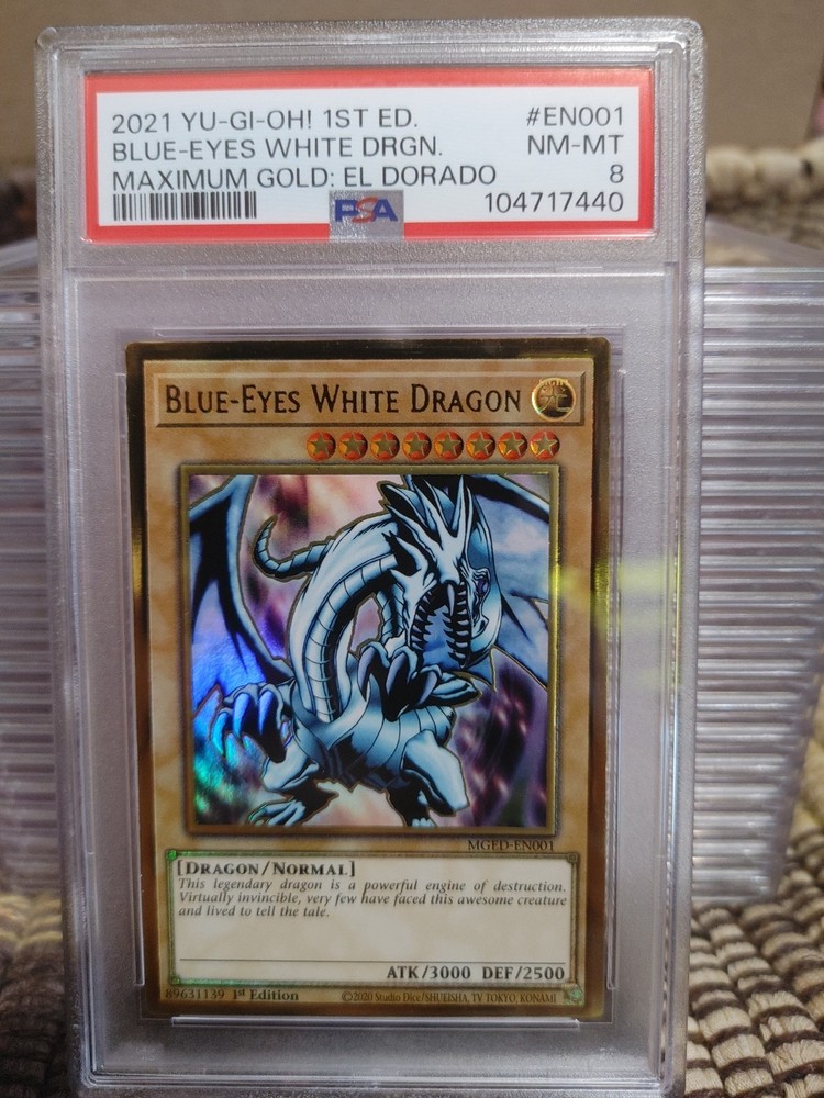 The product is a 2021 Yu-Gi-Oh! Legendary Delegates Season 2 card EN001 featuring the Blue-Eyes White Dragon. This first edition card is attributed to the white color and is highly sought after by collectors of Yu-Gi-Oh! TCG. The card's rarity, unique design, and character make it a valuable addition to any card collection.