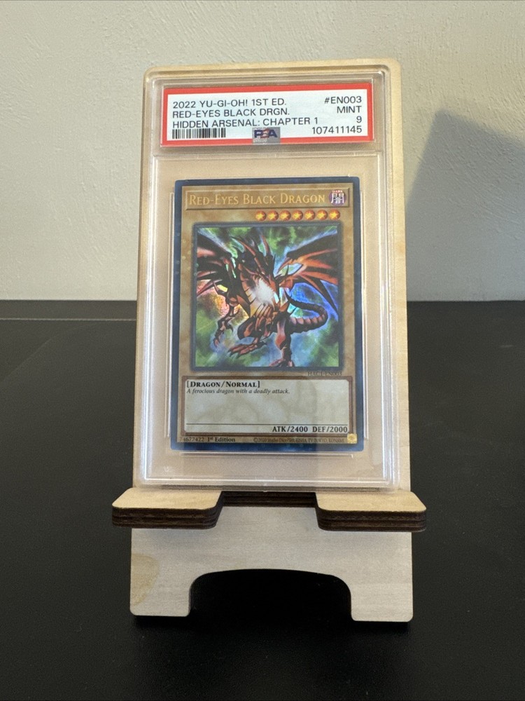 The 2022 YU-GI-OH! 1st Edition Red-Eyes Black Dragon from the Hidden Arsenal set is an ultra rare card featuring a dark attribute and dragon monster type. Manufactured by Konami in the United States, this holo card is graded a 9 by Professional Sports Authenticator (PSA) and is in near mint condition. With its eye-catching design and 1st Edition feature, this collectible card is a must-have for any Yu-Gi-Oh! TCG enthusiast looking to enhance their collection with a high-quality and rare addition.