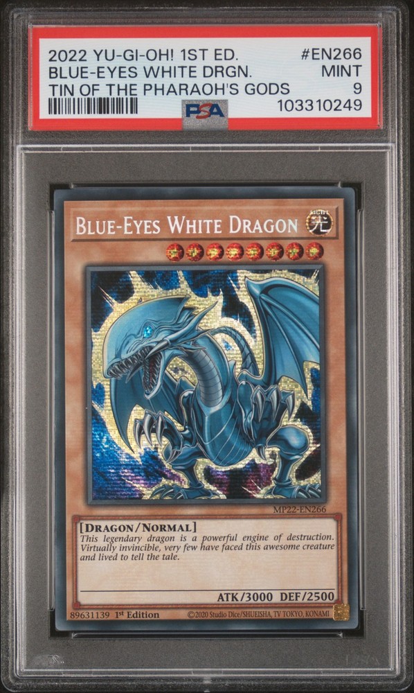 2022 YU-GI-OH! TIN OF THE PHARAOH'S GODS 1ST EDITION #EN266 BLUE-EYES WHITE DRAGON PSA 9 2022 YU-GI-OH! TIN OF THE PHARAOH'S GODS 1ST EDITION #EN266 BLUE-EYES WHITE DRAGON PSA 9 Purchase Info Thank you for your interest in this item consigned with PSA! By purchasing or making an offer on this item, you acknowledge and agree to the following terms: All sales are final. Returns not accepted. Payment must be made upon purchase of the item. All items are sold "as is" and without warranty of Collectors Universe, Inc. (d/b/a PSA), and ANY AND ALL IMPLIED WARRANTIES ARE DISCLAIMED AND EXCLUDED. Sales tax may apply depending on shipping address. PSA does not guarantee that another third-party grading company's authentication or certification of an item as genuine is correct or accurate. Neither a difference of opinion between third-party grading companies about authenticity, nor a company's subsequent reversal of its earlier authentication or certification of an item, will be a basis for rescinding a sale. Any dispute with another third-party grading company relating to the authenticity of an item must be resolved directly with that other company. Collectors' maximum liability in the event of loss or damage to an item during shipping will be the lesser of (a) the price paid for the item and (b) the change in fair market value of the item. You release Collectors from all other liability including for any claims of punitive damages, emotional distress, consequential damages, lost profits, or lost interest, except as prohibited by law. Shipping Purchased Items will be shipped directly from PSA Vault. You stay hands-free. PSA Vault When you purchase this item, you can save on sales tax and selling fees by keeping it in the PSA Vault, official Vault of eBay. Items already in PSA Vault and will be sent to PSA Vault will have no shipping charge Storage of any items with the PSA Vault will be subject to the PSA Vault Terms of Service. Consignment PSA has competitive rates on the world's largest collectibles marketplace with the option to list from the PSA Vault or immediately after PSA authentication and grading. Sale Price Under $100 $100 - $499 $500 - $999 $1,000 - $2,499 $2,500 - $4,999 $5,000+ Seller Fee 16% 14% 13% 10% 9% 7% Sellers pay a single fee as reflected above; no additional eBay fees are incurred. There is a $5 minimum fee on sold items.