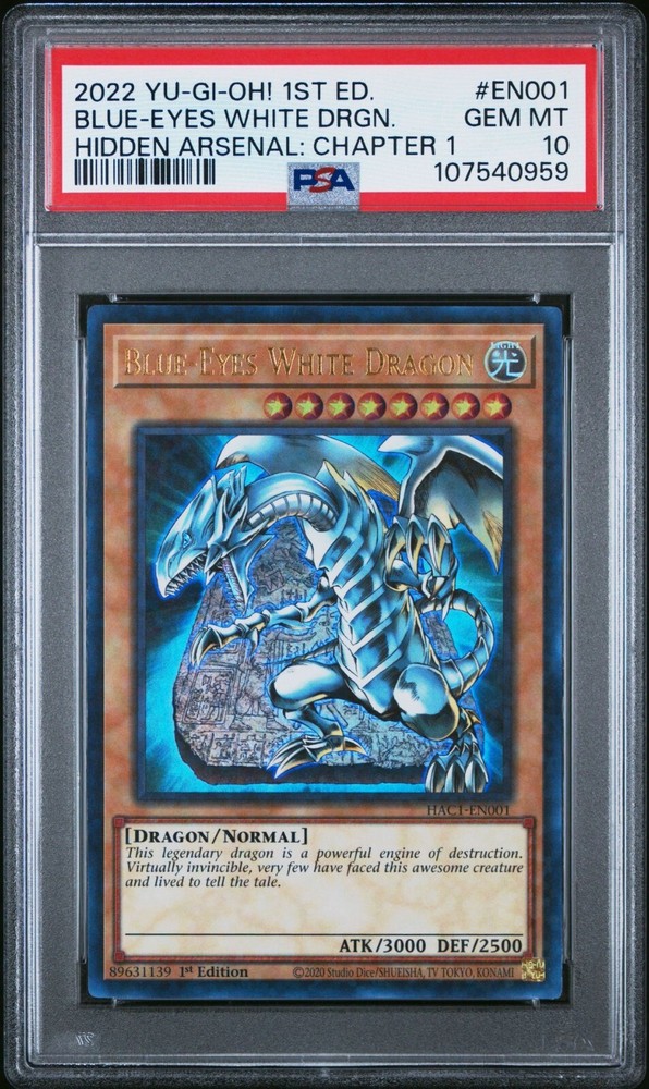 Elevate your Yu-Gi-Oh! TCG collection with the iconic Blue-Eyes White Dragon from the Hidden Arsenal Chapter 1 set. This Ultra Rare card, numbered HAC1-EN001, has been meticulously preserved, ensuring it remains a pristine addition to your deck or display. The English language card is a must-have for enthusiasts seeking to enhance their game with powerful spellcaster options. Blue-Eyes White Dragon is not just a card; it's a symbol of strength and rarity within the Yu-Gi-Oh! universe. With its PSA 10 GEM MINT grading, you can be confident in the quality and potential impact this card can have on your collection or gameplay. Secure this legendary card and own a piece of the rich Yu-Gi-Oh! history.