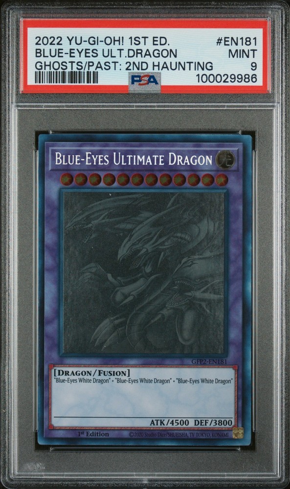 Step right into the realm of Yu-Gi-Oh! with this mesmerizing 2022 Blue-Eyes Ultimate Dragon card - Ghosts from the Past: The 2nd Haunting, a true gem for collectors worldwide. Card number EN181, this spectacular offering from the renowned Yu-Gi-Oh! brand is a force to be reckoned with. Graded a solid PSA 9, it's a testament to the impeccable condition and quality this card possesses. Embrace the fiery spirit of the Blue-Eyes Ultimate Dragon, a legendary creature that stands as a symbol of power and invincibility in the Yu-Gi-Oh! universe. The intricate design and stunning details of this card bring this iconic beast to life, making it a must-have addition to any serious collection. Its eerie ghost-like manifestation from the 2nd Haunting set adds an extra layer of intrigue and allure to the card, making it a unique variant of the classic Blue-Eyes Ultimate Dragon. This card isn't just a piece of trading card history, it's a piece of art, a treasure that encapsulates the thrilling world of duels and battles, of strategy and wit. Whether you're a die-hard Yu-Gi-Oh! fan, a seasoned collector, or simply someone who appreciates the beauty and craftsmanship of trading cards, this 2022 Blue-Eyes Ultimate Dragon card from the Ghosts from the Past: The 2nd Haunting set is sure to leave you spellbound. Don't miss the chance to own this spectacular card and let it take pride of place in your collection.