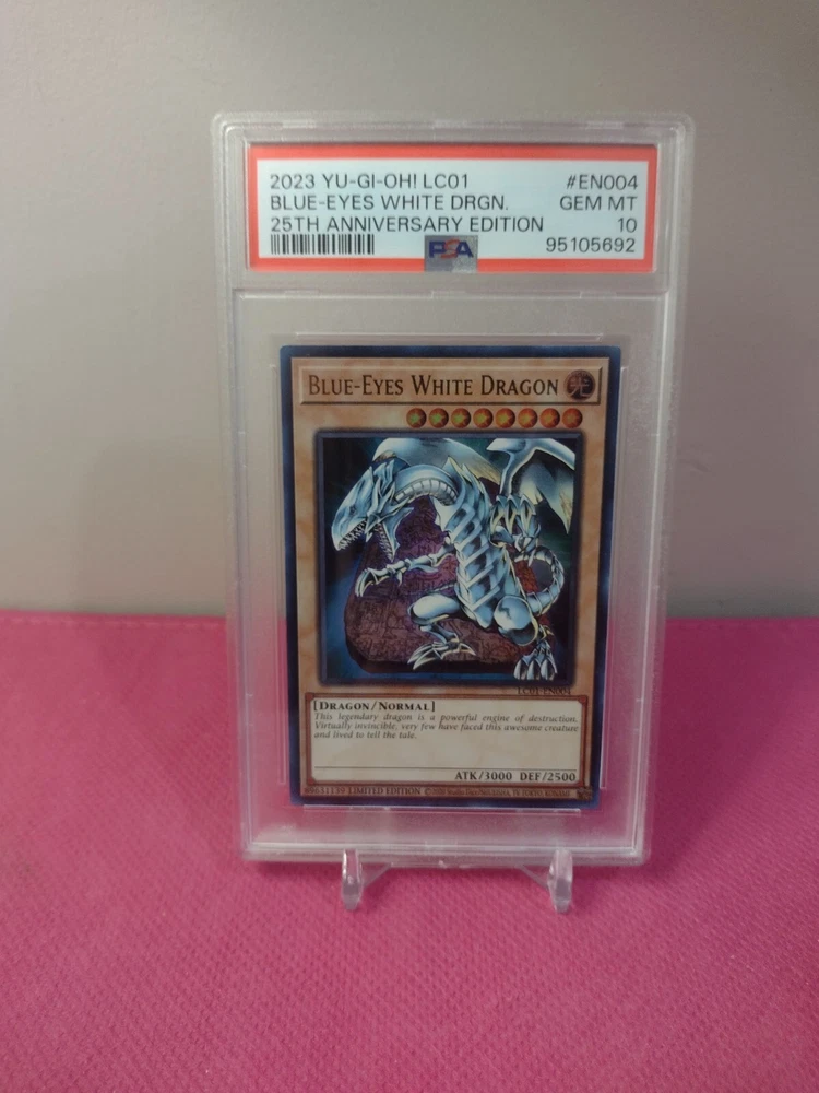 This limited edition Blue-Eyes White Dragon card is a must-have for any Yu-Gi-Oh! TCG collector. The card features the iconic Blue-Eyes White Dragon player in a stunning blue color, and is certified with a unique certification number that can be seen in the photos. This single-parallel card is an original, manufactured by Konami in 2023, and has been graded as PSA Gem Mt 10 by a professional grader. The card is part of the 25th Anniversary Edition and is perfect for players and collectors alike. It is a valuable addition to any collection and is sure to impress. Don't miss out on the opportunity to own this rare card.