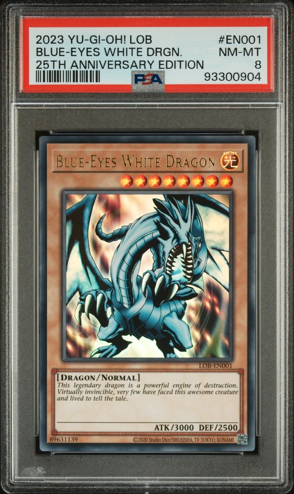 2023 YU-GI-OH! LEGEND OF BLUE EYES WHITE DRAGON 25TH ANNIVERSARY EDITION #EN001 BLUE-EYES WHITE DRAGON PSA 8 2023 YU-GI-OH! LEGEND OF BLUE EYES WHITE DRAGON 25TH ANNIVERSARY EDITION #EN001 BLUE-EYES WHITE DRAGON PSA 8 Purchase Info Thank you for your interest in this item consigned with PSA! By purchasing or making an offer on this item, you acknowledge and agree to the following terms: All sales are final. Returns not accepted. Payment must be made upon purchase of the item. All items are sold "as is" and without warranty of Collectors Universe, Inc. (d/b/a PSA), and ANY AND ALL IMPLIED WARRANTIES ARE DISCLAIMED AND EXCLUDED. Sales tax may apply depending on shipping address. PSA does not guarantee that another third-party grading company's authentication or certification of an item as genuine is correct or accurate. Neither a difference of opinion between third-party grading companies about authenticity, nor a company's subsequent reversal of its earlier authentication or certification of an item, will be a basis for rescinding a sale. Any dispute with another third-party grading company relating to the authenticity of an item must be resolved directly with that other company. Collectors' maximum liability in the event of loss or damage to an item during shipping will be the lesser of (a) the price paid for the item and (b) the change in fair market value of the item. You release Collectors from all other liability including for any claims of punitive damages, emotional distress, consequential damages, lost profits, or lost interest, except as prohibited by law. Shipping Purchased Items will be shipped directly from PSA Vault. You stay hands-free. PSA Vault When you purchase this item, you can save on sales tax and selling fees by keeping it in the PSA Vault, official Vault of eBay. Items already in PSA Vault and will be sent to PSA Vault will have no shipping charge Storage of any items with the PSA Vault will be subject to the PSA Vault Terms of Service. Consignment PSA has competitive rates on the world's largest collectibles marketplace with the option to list from the PSA Vault or immediately after PSA authentication and grading. Sale Price Under $100 $100 - $499 $500 - $999 $1,000 - $2,499 $2,500 - $4,999 $5,000+ Seller Fee 16% 14% 13% 10% 9% 7% Sellers pay a single fee as reflected above; no additional eBay fees are incurred. There is a $5 minimum fee on sold items.