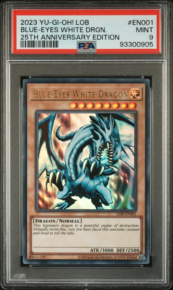 2023 YU-GI-OH! LEGEND OF BLUE EYES WHITE DRAGON 25TH ANNIVERSARY EDITION #EN001 BLUE-EYES WHITE DRAGON PSA 9 2023 YU-GI-OH! LEGEND OF BLUE EYES WHITE DRAGON 25TH ANNIVERSARY EDITION #EN001 BLUE-EYES WHITE DRAGON PSA 9 Purchase Info Thank you for your interest in this item consigned with PSA! By purchasing or making an offer on this item, you acknowledge and agree to the following terms: All sales are final. Returns not accepted. Payment must be made upon purchase of the item. All items are sold "as is" and without warranty of Collectors Universe, Inc. (d/b/a PSA), and ANY AND ALL IMPLIED WARRANTIES ARE DISCLAIMED AND EXCLUDED. Sales tax may apply depending on shipping address. PSA does not guarantee that another third-party grading company's authentication or certification of an item as genuine is correct or accurate. Neither a difference of opinion between third-party grading companies about authenticity, nor a company's subsequent reversal of its earlier authentication or certification of an item, will be a basis for rescinding a sale. Any dispute with another third-party grading company relating to the authenticity of an item must be resolved directly with that other company. Collectors' maximum liability in the event of loss or damage to an item during shipping will be the lesser of (a) the price paid for the item and (b) the change in fair market value of the item. You release Collectors from all other liability including for any claims of punitive damages, emotional distress, consequential damages, lost profits, or lost interest, except as prohibited by law. Shipping Purchased Items will be shipped directly from PSA Vault. You stay hands-free. PSA Vault When you purchase this item, you can save on sales tax and selling fees by keeping it in the PSA Vault, official Vault of eBay. Items already in PSA Vault and will be sent to PSA Vault will have no shipping charge Storage of any items with the PSA Vault will be subject to the PSA Vault Terms of Service. Consignment PSA has competitive rates on the world's largest collectibles marketplace with the option to list from the PSA Vault or immediately after PSA authentication and grading. Sale Price Under $100 $100 - $499 $500 - $999 $1,000 - $2,499 $2,500 - $4,999 $5,000+ Seller Fee 16% 14% 13% 10% 9% 7% Sellers pay a single fee as reflected above; no additional eBay fees are incurred. There is a $5 minimum fee on sold items.