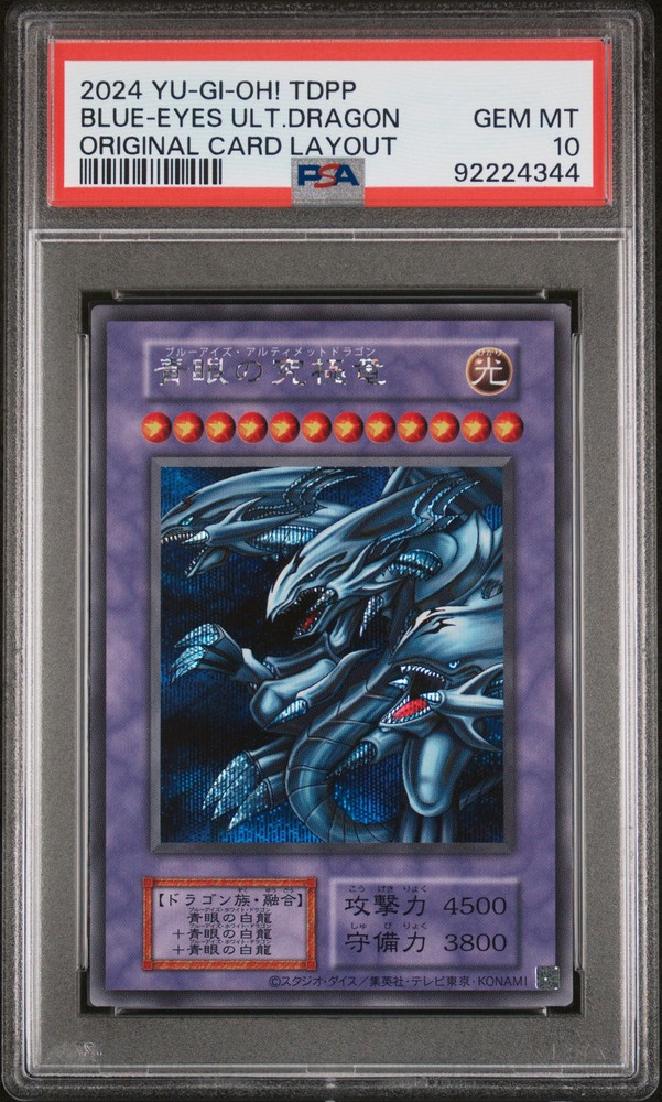 2024 YU-GI-OH! JAPANESE TDPP-PREMIUM PACK: THE LEGEND OF DUELIST QUARTER CENTURY EDITION ORIGINAL CARD LAYOUT BLUE-EYES ULTIMATE DRAGON PSA 10 2024 YU-GI-OH! JAPANESE TDPP-PREMIUM PACK: THE LEGEND OF DUELIST QUARTER CENTURY EDITION ORIGINAL CARD LAYOUT BLUE-EYES ULTIMATE DRAGON PSA 10 Purchase Info Thank you for your interest in this item consigned with PSA! By purchasing or making an offer on this item, you acknowledge and agree to the following terms: All sales are final. Returns not accepted. Payment must be made upon purchase of the item. All items are sold "as is" and without warranty of Collectors Universe, Inc. (d/b/a PSA), and ANY AND ALL IMPLIED WARRANTIES ARE DISCLAIMED AND EXCLUDED. Sales tax may apply depending on shipping address. PSA does not guarantee that another third-party grading company's authentication or certification of an item as genuine is correct or accurate. Neither a difference of opinion between third-party grading companies about authenticity, nor a company's subsequent reversal of its earlier authentication or certification of an item, will be a basis for rescinding a sale. Any dispute with another third-party grading company relating to the authenticity of an item must be resolved directly with that other company. Collectors' maximum liability in the event of loss or damage to an item during shipping will be the lesser of (a) the price paid for the item and (b) the change in fair market value of the item. You release Collectors from all other liability including for any claims of punitive damages, emotional distress, consequential damages, lost profits, or lost interest, except as prohibited by law. Shipping Purchased Items will be shipped directly from PSA Vault. You stay hands-free. PSA Vault When you purchase this item, you can save on sales tax and selling fees by keeping it in the PSA Vault, official Vault of eBay. Items already in PSA Vault and will be sent to PSA Vault will have no shipping charge Storage of any items with the PSA Vault will be subject to the PSA Vault Terms of Service. Consignment PSA has competitive rates on the world's largest collectibles marketplace with the option to list from the PSA Vault or immediately after PSA authentication and grading. Sale Price Under $100 $100 - $499 $500 - $999 $1,000 - $2,499 $2,500 - $4,999 $5,000+ Seller Fee 16% 14% 13% 10% 9% 7% Sellers pay a single fee as reflected above; no additional eBay fees are incurred. There is a $5 minimum fee on sold items.