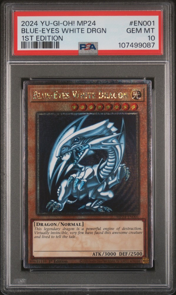 2024 YU-GI-OH! MP24-25TH ANNIVERSARY TIN: DUELING MIRRORS 1ST EDITION #EN001 BLUE-EYES WHITE DRAGON PSA 10 2024 YU-GI-OH! MP24-25TH ANNIVERSARY TIN: DUELING MIRRORS 1ST EDITION #EN001 BLUE-EYES WHITE DRAGON PSA 10 Purchase Info Thank you for your interest in this item consigned with PSA! By purchasing or making an offer on this item, you acknowledge and agree to the following terms: All sales are final. Returns not accepted. Payment must be made upon purchase of the item. All items are sold "as is" and without warranty of Collectors Universe, Inc. (d/b/a PSA), and ANY AND ALL IMPLIED WARRANTIES ARE DISCLAIMED AND EXCLUDED. Sales tax may apply depending on shipping address. PSA does not guarantee that another third-party grading company's authentication or certification of an item as genuine is correct or accurate. Neither a difference of opinion between third-party grading companies about authenticity, nor a company's subsequent reversal of its earlier authentication or certification of an item, will be a basis for rescinding a sale. Any dispute with another third-party grading company relating to the authenticity of an item must be resolved directly with that other company. Collectors' maximum liability in the event of loss or damage to an item during shipping will be the lesser of (a) the price paid for the item and (b) the change in fair market value of the item. You release Collectors from all other liability including for any claims of punitive damages, emotional distress, consequential damages, lost profits, or lost interest, except as prohibited by law. Shipping Purchased Items will be shipped directly from PSA Vault. You stay hands-free. PSA Vault When you purchase this item, you can save on sales tax and selling fees by keeping it in the PSA Vault, official Vault of eBay. Items already in PSA Vault and will be sent to PSA Vault will have no shipping charge Storage of any items with the PSA Vault will be subject to the PSA Vault Terms of Service. Consignment PSA has competitive rates on the world's largest collectibles marketplace with the option to list from the PSA Vault or immediately after PSA authentication and grading. Sale Price Under $100 $100 - $499 $500 - $999 $1,000 - $2,499 $2,500 - $4,999 $5,000+ Seller Fee 16% 14% 13% 10% 9% 7% Sellers pay a single fee as reflected above; no additional eBay fees are incurred. There is a $5 minimum fee on sold items.