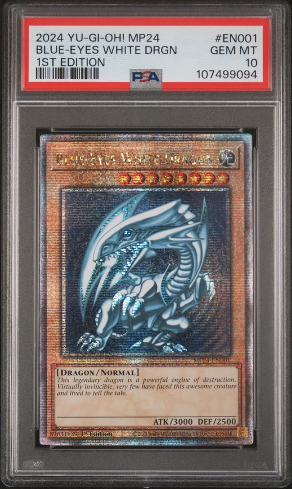 2024 YU-GI-OH! MP24-25TH ANNIVERSARY TIN: DUELING MIRRORS 1ST EDITION #EN001 BLUE-EYES WHITE DRAGON PSA 10 2024 YU-GI-OH! MP24-25TH ANNIVERSARY TIN: DUELING MIRRORS 1ST EDITION #EN001 BLUE-EYES WHITE DRAGON PSA 10 Purchase Info Thank you for your interest in this item consigned with PSA! By purchasing or making an offer on this item, you acknowledge and agree to the following terms: All sales are final. Returns not accepted. Payment must be made upon purchase of the item. All items are sold "as is" and without warranty of Collectors Universe, Inc. (d/b/a PSA), and ANY AND ALL IMPLIED WARRANTIES ARE DISCLAIMED AND EXCLUDED. Sales tax may apply depending on shipping address. PSA does not guarantee that another third-party grading company's authentication or certification of an item as genuine is correct or accurate. Neither a difference of opinion between third-party grading companies about authenticity, nor a company's subsequent reversal of its earlier authentication or certification of an item, will be a basis for rescinding a sale. Any dispute with another third-party grading company relating to the authenticity of an item must be resolved directly with that other company. Collectors' maximum liability in the event of loss or damage to an item during shipping will be the lesser of (a) the price paid for the item and (b) the change in fair market value of the item. You release Collectors from all other liability including for any claims of punitive damages, emotional distress, consequential damages, lost profits, or lost interest, except as prohibited by law. Shipping Purchased Items will be shipped directly from PSA Vault. You stay hands-free. PSA Vault When you purchase this item, you can save on sales tax and selling fees by keeping it in the PSA Vault, official Vault of eBay. Items already in PSA Vault and will be sent to PSA Vault will have no shipping charge Storage of any items with the PSA Vault will be subject to the PSA Vault Terms of Service. Consignment PSA has competitive rates on the world's largest collectibles marketplace with the option to list from the PSA Vault or immediately after PSA authentication and grading. Sale Price Under $100 $100 - $499 $500 - $999 $1,000 - $2,499 $2,500 - $4,999 $5,000+ Seller Fee 16% 14% 13% 10% 9% 7% Sellers pay a single fee as reflected above; no additional eBay fees are incurred. There is a $5 minimum fee on sold items.