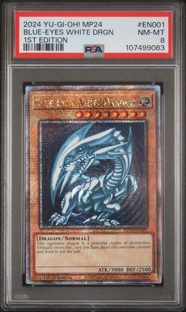 2024 YU-GI-OH! MP24-25TH ANNIVERSARY TIN: DUELING MIRRORS 1ST EDITION #EN001 BLUE-EYES WHITE DRAGON PSA 8 2024 YU-GI-OH! MP24-25TH ANNIVERSARY TIN: DUELING MIRRORS 1ST EDITION #EN001 BLUE-EYES WHITE DRAGON PSA 8 Purchase Info Thank you for your interest in this item consigned with PSA! By purchasing or making an offer on this item, you acknowledge and agree to the following terms: All sales are final. Returns not accepted. Payment must be made upon purchase of the item. All items are sold "as is" and without warranty of Collectors Universe, Inc. (d/b/a PSA), and ANY AND ALL IMPLIED WARRANTIES ARE DISCLAIMED AND EXCLUDED. Sales tax may apply depending on shipping address. PSA does not guarantee that another third-party grading company's authentication or certification of an item as genuine is correct or accurate. Neither a difference of opinion between third-party grading companies about authenticity, nor a company's subsequent reversal of its earlier authentication or certification of an item, will be a basis for rescinding a sale. Any dispute with another third-party grading company relating to the authenticity of an item must be resolved directly with that other company. Collectors' maximum liability in the event of loss or damage to an item during shipping will be the lesser of (a) the price paid for the item and (b) the change in fair market value of the item. You release Collectors from all other liability including for any claims of punitive damages, emotional distress, consequential damages, lost profits, or lost interest, except as prohibited by law. Shipping Purchased Items will be shipped directly from PSA Vault. You stay hands-free. PSA Vault When you purchase this item, you can save on sales tax and selling fees by keeping it in the PSA Vault, official Vault of eBay. Items already in PSA Vault and will be sent to PSA Vault will have no shipping charge Storage of any items with the PSA Vault will be subject to the PSA Vault Terms of Service. Consignment PSA has competitive rates on the world's largest collectibles marketplace with the option to list from the PSA Vault or immediately after PSA authentication and grading. Sale Price Under $100 $100 - $499 $500 - $999 $1,000 - $2,499 $2,500 - $4,999 $5,000+ Seller Fee 16% 14% 13% 10% 9% 7% Sellers pay a single fee as reflected above; no additional eBay fees are incurred. There is a $5 minimum fee on sold items.