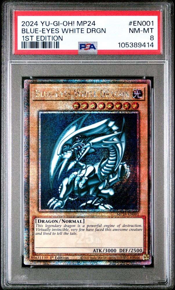 2024 YU-GI-OH! MP24-25TH ANNIVERSARY TIN: DUELING MIRRORS 1ST EDITION #EN001 BLUE-EYES WHITE DRAGON PSA 8 2024 YU-GI-OH! MP24-25TH ANNIVERSARY TIN: DUELING MIRRORS 1ST EDITION #EN001 BLUE-EYES WHITE DRAGON PSA 8 Purchase Info Thank you for your interest in this item consigned with PSA! By purchasing or making an offer on this item, you acknowledge and agree to the following terms: All sales are final. Returns not accepted. Payment must be made upon purchase of the item. All items are sold "as is" and without warranty of Collectors Universe, Inc. (d/b/a PSA), and ANY AND ALL IMPLIED WARRANTIES ARE DISCLAIMED AND EXCLUDED. Sales tax may apply depending on shipping address. PSA does not guarantee that another third-party grading company's authentication or certification of an item as genuine is correct or accurate. Neither a difference of opinion between third-party grading companies about authenticity, nor a company's subsequent reversal of its earlier authentication or certification of an item, will be a basis for rescinding a sale. Any dispute with another third-party grading company relating to the authenticity of an item must be resolved directly with that other company. Collectors' maximum liability in the event of loss or damage to an item during shipping will be the lesser of (a) the price paid for the item and (b) the change in fair market value of the item. You release Collectors from all other liability including for any claims of punitive damages, emotional distress, consequential damages, lost profits, or lost interest, except as prohibited by law. Shipping Purchased Items will be shipped directly from PSA Vault. You stay hands-free. PSA Vault When you purchase this item, you can save on sales tax and selling fees by keeping it in the PSA Vault, official Vault of eBay. Items already in PSA Vault and will be sent to PSA Vault will have no shipping charge Storage of any items with the PSA Vault will be subject to the PSA Vault Terms of Service. Consignment PSA has competitive rates on the world's largest collectibles marketplace with the option to list from the PSA Vault or immediately after PSA authentication and grading. Sale Price Under $100 $100 - $499 $500 - $999 $1,000 - $2,499 $2,500 - $4,999 $5,000+ Seller Fee 16% 14% 13% 10% 9% 7% Sellers pay a single fee as reflected above; no additional eBay fees are incurred. There is a $5 minimum fee on sold items.