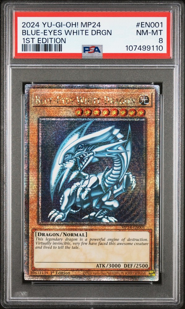 2024 YU-GI-OH! MP24-25TH ANNIVERSARY TIN: DUELING MIRRORS 1ST EDITION #EN001 BLUE-EYES WHITE DRAGON PSA 8 2024 YU-GI-OH! MP24-25TH ANNIVERSARY TIN: DUELING MIRRORS 1ST EDITION #EN001 BLUE-EYES WHITE DRAGON PSA 8 Purchase Info Thank you for your interest in this item consigned with PSA! By purchasing or making an offer on this item, you acknowledge and agree to the following terms: All sales are final. Returns not accepted. Payment must be made upon purchase of the item. All items are sold "as is" and without warranty of Collectors Universe, Inc. (d/b/a PSA), and ANY AND ALL IMPLIED WARRANTIES ARE DISCLAIMED AND EXCLUDED. Sales tax may apply depending on shipping address. PSA does not guarantee that another third-party grading company's authentication or certification of an item as genuine is correct or accurate. Neither a difference of opinion between third-party grading companies about authenticity, nor a company's subsequent reversal of its earlier authentication or certification of an item, will be a basis for rescinding a sale. Any dispute with another third-party grading company relating to the authenticity of an item must be resolved directly with that other company. Collectors' maximum liability in the event of loss or damage to an item during shipping will be the lesser of (a) the price paid for the item and (b) the change in fair market value of the item. You release Collectors from all other liability including for any claims of punitive damages, emotional distress, consequential damages, lost profits, or lost interest, except as prohibited by law. Shipping Purchased Items will be shipped directly from PSA Vault. You stay hands-free. PSA Vault When you purchase this item, you can save on sales tax and selling fees by keeping it in the PSA Vault, official Vault of eBay. Items already in PSA Vault and will be sent to PSA Vault will have no shipping charge Storage of any items with the PSA Vault will be subject to the PSA Vault Terms of Service. Consignment PSA has competitive rates on the world's largest collectibles marketplace with the option to list from the PSA Vault or immediately after PSA authentication and grading. Sale Price Under $100 $100 - $499 $500 - $999 $1,000 - $2,499 $2,500 - $4,999 $5,000+ Seller Fee 16% 14% 13% 10% 9% 7% Sellers pay a single fee as reflected above; no additional eBay fees are incurred. There is a $5 minimum fee on sold items.