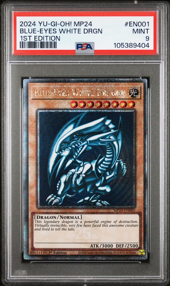 2024 YU-GI-OH! MP24-25TH ANNIVERSARY TIN: DUELING MIRRORS 1ST EDITION #EN001 BLUE-EYES WHITE DRAGON PSA 9 2024 YU-GI-OH! MP24-25TH ANNIVERSARY TIN: DUELING MIRRORS 1ST EDITION #EN001 BLUE-EYES WHITE DRAGON PSA 9 Purchase Info Thank you for your interest in this item consigned with PSA! By purchasing or making an offer on this item, you acknowledge and agree to the following terms: All sales are final. Returns not accepted. Payment must be made upon purchase of the item. All items are sold "as is" and without warranty of Collectors Universe, Inc. (d/b/a PSA), and ANY AND ALL IMPLIED WARRANTIES ARE DISCLAIMED AND EXCLUDED. Sales tax may apply depending on shipping address. PSA does not guarantee that another third-party grading company's authentication or certification of an item as genuine is correct or accurate. Neither a difference of opinion between third-party grading companies about authenticity, nor a company's subsequent reversal of its earlier authentication or certification of an item, will be a basis for rescinding a sale. Any dispute with another third-party grading company relating to the authenticity of an item must be resolved directly with that other company. Collectors' maximum liability in the event of loss or damage to an item during shipping will be the lesser of (a) the price paid for the item and (b) the change in fair market value of the item. You release Collectors from all other liability including for any claims of punitive damages, emotional distress, consequential damages, lost profits, or lost interest, except as prohibited by law. Shipping Purchased Items will be shipped directly from PSA Vault. You stay hands-free. PSA Vault When you purchase this item, you can save on sales tax and selling fees by keeping it in the PSA Vault, official Vault of eBay. Items already in PSA Vault and will be sent to PSA Vault will have no shipping charge Storage of any items with the PSA Vault will be subject to the PSA Vault Terms of Service. Consignment PSA has competitive rates on the world's largest collectibles marketplace with the option to list from the PSA Vault or immediately after PSA authentication and grading. Sale Price Under $100 $100 - $499 $500 - $999 $1,000 - $2,499 $2,500 - $4,999 $5,000+ Seller Fee 16% 14% 13% 10% 9% 7% Sellers pay a single fee as reflected above; no additional eBay fees are incurred. There is a $5 minimum fee on sold items.