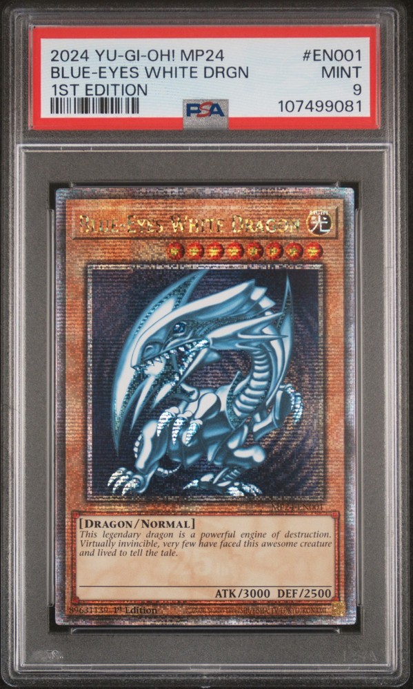 2024 YU-GI-OH! MP24-25TH ANNIVERSARY TIN: DUELING MIRRORS 1ST EDITION #EN001 BLUE-EYES WHITE DRAGON PSA 9 2024 YU-GI-OH! MP24-25TH ANNIVERSARY TIN: DUELING MIRRORS 1ST EDITION #EN001 BLUE-EYES WHITE DRAGON PSA 9 Purchase Info Thank you for your interest in this item consigned with PSA! By purchasing or making an offer on this item, you acknowledge and agree to the following terms: All sales are final. Returns not accepted. Payment must be made upon purchase of the item. All items are sold "as is" and without warranty of Collectors Universe, Inc. (d/b/a PSA), and ANY AND ALL IMPLIED WARRANTIES ARE DISCLAIMED AND EXCLUDED. Sales tax may apply depending on shipping address. PSA does not guarantee that another third-party grading company's authentication or certification of an item as genuine is correct or accurate. Neither a difference of opinion between third-party grading companies about authenticity, nor a company's subsequent reversal of its earlier authentication or certification of an item, will be a basis for rescinding a sale. Any dispute with another third-party grading company relating to the authenticity of an item must be resolved directly with that other company. Collectors' maximum liability in the event of loss or damage to an item during shipping will be the lesser of (a) the price paid for the item and (b) the change in fair market value of the item. You release Collectors from all other liability including for any claims of punitive damages, emotional distress, consequential damages, lost profits, or lost interest, except as prohibited by law. Shipping Purchased Items will be shipped directly from PSA Vault. You stay hands-free. PSA Vault When you purchase this item, you can save on sales tax and selling fees by keeping it in the PSA Vault, official Vault of eBay. Items already in PSA Vault and will be sent to PSA Vault will have no shipping charge Storage of any items with the PSA Vault will be subject to the PSA Vault Terms of Service. Consignment PSA has competitive rates on the world's largest collectibles marketplace with the option to list from the PSA Vault or immediately after PSA authentication and grading. Sale Price Under $100 $100 - $499 $500 - $999 $1,000 - $2,499 $2,500 - $4,999 $5,000+ Seller Fee 16% 14% 13% 10% 9% 7% Sellers pay a single fee as reflected above; no additional eBay fees are incurred. There is a $5 minimum fee on sold items.
