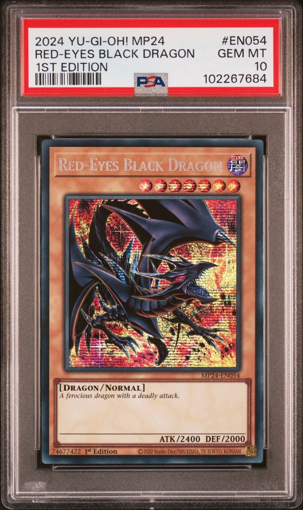 2024 YU-GI-OH! MP24-25TH ANNIVERSARY TIN: DUELING MIRRORS 1ST EDITION #EN054 RED-EYES BLACK DRAGON PSA 10 2024 YU-GI-OH! MP24-25TH ANNIVERSARY TIN: DUELING MIRRORS 1ST EDITION #EN054 RED-EYES BLACK DRAGON PSA 10 Purchase Info Thank you for your interest in this item consigned with PSA! By purchasing or making an offer on this item, you acknowledge and agree to the following terms: All sales are final. Returns not accepted. Payment must be made upon purchase of the item. All items are sold "as is" and without warranty of Collectors Universe, Inc. (d/b/a PSA), and ANY AND ALL IMPLIED WARRANTIES ARE DISCLAIMED AND EXCLUDED. Sales tax may apply depending on shipping address. PSA does not guarantee that another third-party grading company's authentication or certification of an item as genuine is correct or accurate. Neither a difference of opinion between third-party grading companies about authenticity, nor a company's subsequent reversal of its earlier authentication or certification of an item, will be a basis for rescinding a sale. Any dispute with another third-party grading company relating to the authenticity of an item must be resolved directly with that other company. Collectors' maximum liability in the event of loss or damage to an item during shipping will be the lesser of (a) the price paid for the item and (b) the change in fair market value of the item. You release Collectors from all other liability including for any claims of punitive damages, emotional distress, consequential damages, lost profits, or lost interest, except as prohibited by law. Shipping Purchased Items will be shipped directly from PSA Vault. You stay hands-free. PSA Vault When you purchase this item, you can save on sales tax and selling fees by keeping it in the PSA Vault, official Vault of eBay. Items already in PSA Vault and will be sent to PSA Vault will have no shipping charge Storage of any items with the PSA Vault will be subject to the PSA Vault Terms of Service. Consignment PSA has competitive rates on the world's largest collectibles marketplace with the option to list from the PSA Vault or immediately after PSA authentication and grading. Sale Price Under $100 $100 - $499 $500 - $999 $1,000 - $2,499 $2,500 - $4,999 $5,000+ Seller Fee 16% 14% 13% 10% 9% 7% Sellers pay a single fee as reflected above; no additional eBay fees are incurred. There is a $5 minimum fee on sold items.