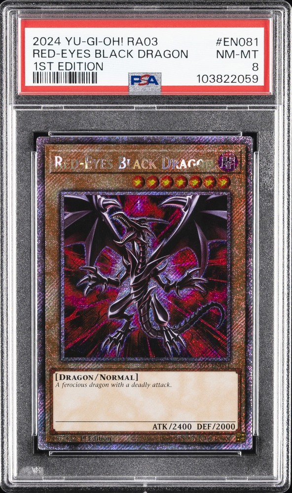 2024 YU-GI-OH! RA03-QUARTER CENTURY BONANZA 1ST EDITION #EN081 RED-EYES BLACK DRAGON PSA 8 2024 YU-GI-OH! RA03-QUARTER CENTURY BONANZA 1ST EDITION #EN081 RED-EYES BLACK DRAGON PSA 8 Purchase Info Thank you for your interest in this item consigned with PSA! By purchasing or making an offer on this item, you acknowledge and agree to the following terms: All sales are final. Returns not accepted. Payment must be made upon purchase of the item. All items are sold "as is" and without warranty of Collectors Universe, Inc. (d/b/a PSA), and ANY AND ALL IMPLIED WARRANTIES ARE DISCLAIMED AND EXCLUDED. Sales tax may apply depending on shipping address. PSA does not guarantee that another third-party grading company's authentication or certification of an item as genuine is correct or accurate. Neither a difference of opinion between third-party grading companies about authenticity, nor a company's subsequent reversal of its earlier authentication or certification of an item, will be a basis for rescinding a sale. Any dispute with another third-party grading company relating to the authenticity of an item must be resolved directly with that other company. Collectors' maximum liability in the event of loss or damage to an item during shipping will be the lesser of (a) the price paid for the item and (b) the change in fair market value of the item. You release Collectors from all other liability including for any claims of punitive damages, emotional distress, consequential damages, lost profits, or lost interest, except as prohibited by law. Shipping Purchased Items will be shipped directly from PSA Vault. You stay hands-free. PSA Vault When you purchase this item, you can save on sales tax and selling fees by keeping it in the PSA Vault, official Vault of eBay. Items already in PSA Vault and will be sent to PSA Vault will have no shipping charge Storage of any items with the PSA Vault will be subject to the PSA Vault Terms of Service. Consignment PSA has competitive rates on the world's largest collectibles marketplace with the option to list from the PSA Vault or immediately after PSA authentication and grading. Sale Price Under $100 $100 - $499 $500 - $999 $1,000 - $2,499 $2,500 - $4,999 $5,000+ Seller Fee 16% 14% 13% 10% 9% 7% Sellers pay a single fee as reflected above; no additional eBay fees are incurred. There is a $5 minimum fee on sold items.