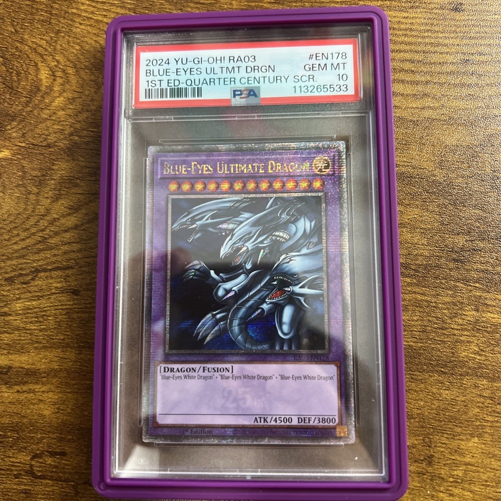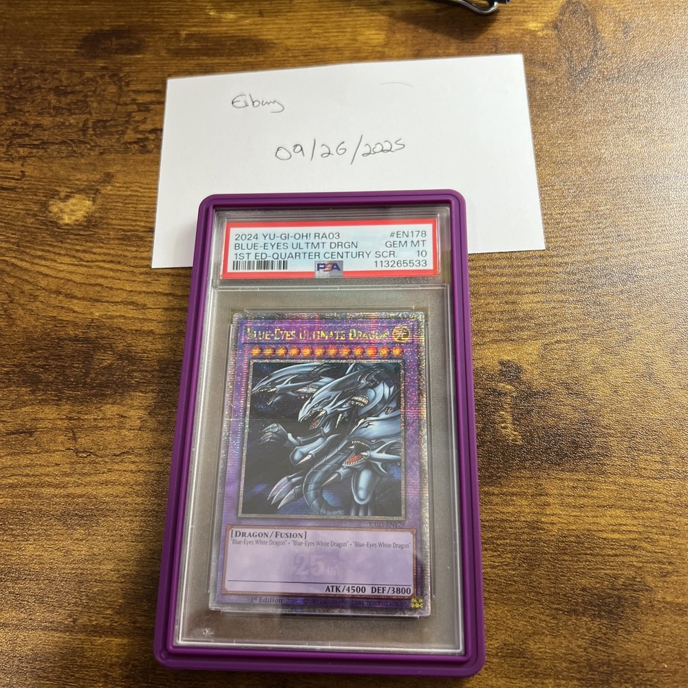 2024 YU-GI-OH! RA03-QUARTER CENTURY BONANZA 1ST EDITION #EN178 BLUE-EYES ULTIMATE DRAGON PSA 10 2024 YU-GI-OH! RA03-QUARTER CENTURY BONANZA 1ST EDITION #EN178 BLUE-EYES ULTIMATE DRAGON PSA 10 Purchase Info Thank you for your interest in this item consigned with PSA! By purchasing or making an offer on this item, you acknowledge and agree to the following terms: All sales are final. Returns not accepted. Payment must be made upon purchase of the item. All items are sold "as is" and without warranty of Collectors Universe, Inc. (d/b/a PSA), and ANY AND ALL IMPLIED WARRANTIES ARE DISCLAIMED AND EXCLUDED. Sales tax may apply depending on shipping address. PSA does not guarantee that another third-party grading company's authentication or certification of an item as genuine is correct or accurate. Neither a difference of opinion between third-party grading companies about authenticity, nor a company's subsequent reversal of its earlier authentication or certification of an item, will be a basis for rescinding a sale. Any dispute with another third-party grading company relating to the authenticity of an item must be resolved directly with that other company. Collectors' maximum liability in the event of loss or damage to an item during shipping will be the lesser of (a) the price paid for the item and (b) the change in fair market value of the item. You release Collectors from all other liability including for any claims of punitive damages, emotional distress, consequential damages, lost profits, or lost interest, except as prohibited by law. Shipping Purchased Items will be shipped directly from PSA Vault. You stay hands-free. PSA Vault When you purchase this item, you can save on sales tax and selling fees by keeping it in the PSA Vault, official Vault of eBay. Items already in PSA Vault and will be sent to PSA Vault will have no shipping charge Storage of any items with the PSA Vault will be subject to the PSA Vault Terms of Service. Consignment PSA has competitive rates on the world's largest collectibles marketplace with the option to list from the PSA Vault or immediately after PSA authentication and grading. Sale Price Under $100 $100 - $499 $500 - $999 $1,000 - $2,499 $2,500 - $4,999 $5,000+ Seller Fee 16% 14% 13% 10% 9% 7% Sellers pay a single fee as reflected above; no additional eBay fees are incurred. There is a $5 minimum fee on sold items.
