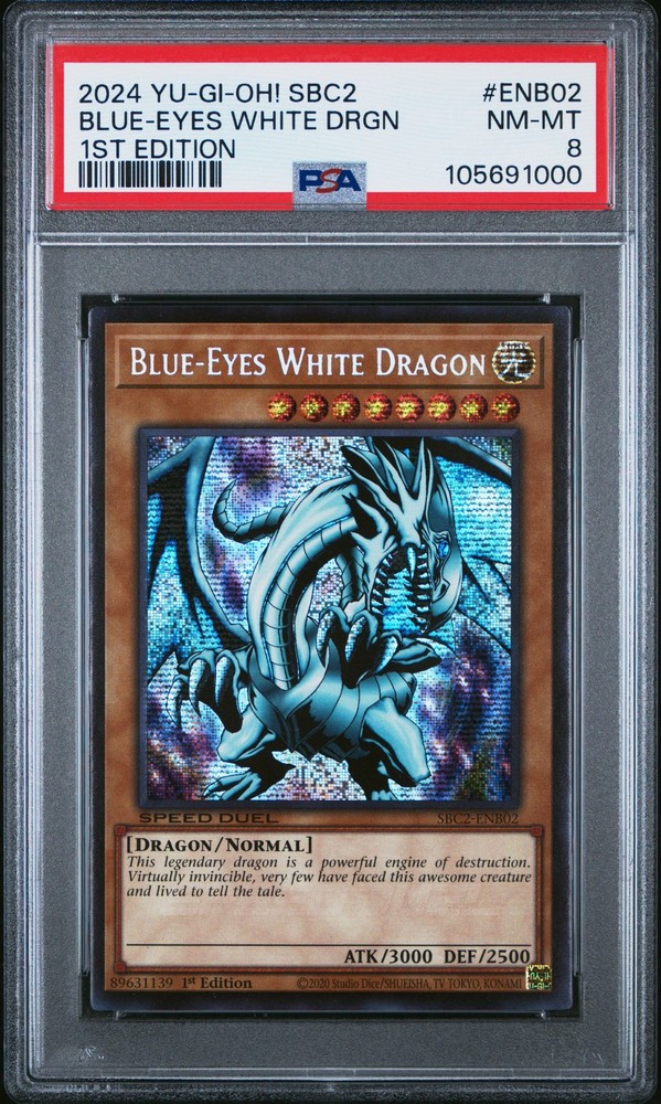 This Blue-Eyes White Dragon PSA 8 is a must-have for any Yu-Gi-Oh! collector. The card is in fantastic condition, and the Speed Duel Battle City Finals edition makes it even more special. The iconic artwork pops, and the PSA grading ensures its authenticity and value. Perfect for display or competitive play—definitely worth adding to your collection!