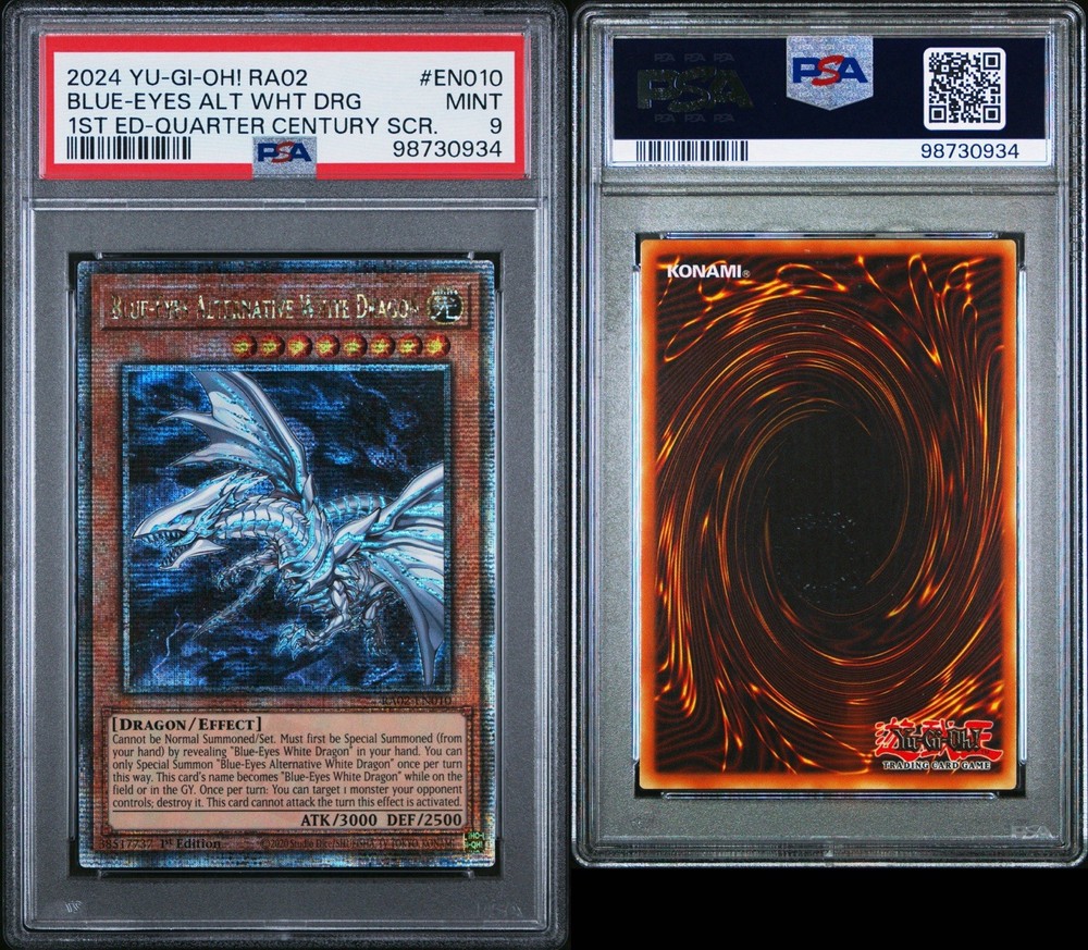 The 2024 Yu-Gi-Oh Blue-Eyes Alternate White Dragon is a highly sought-after collectible card from the Yu-Gi-Oh TCG. This particular card is a Secret Rare 1st Edition graded as a PSA 9, making it a desirable addition for any collector. Manufactured by Konami, this English-language card is part of the Yugi set and features the iconic Blue-Eyes Attribute, perfect for fans of the game looking for a unique and rare piece to add to their collection.