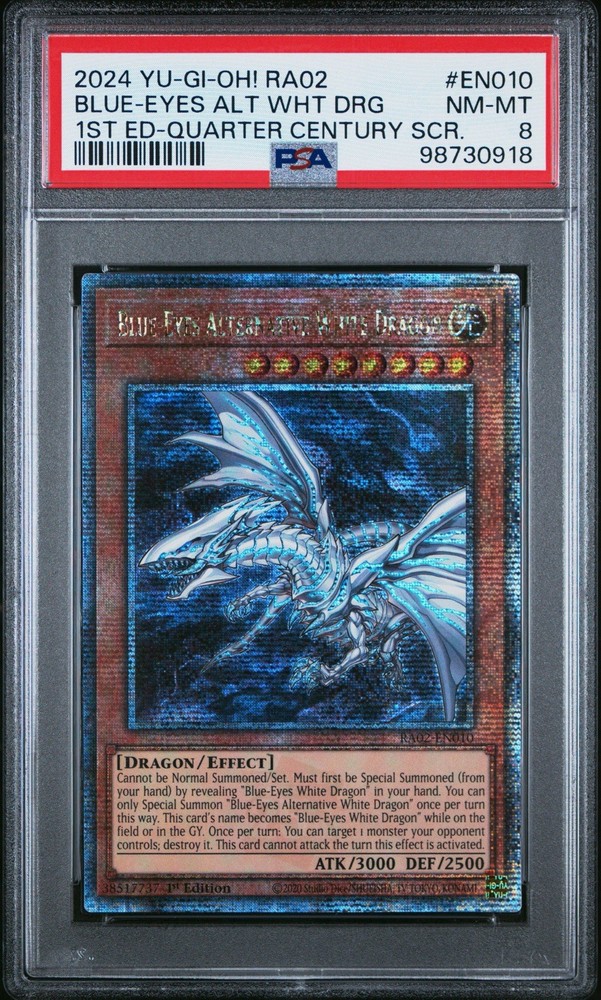 The 2024 Yu-Gi-Oh! Blue-Eyes Alternative White Dragon is a highly sought-after collectible card celebrating the 25th anniversary of the Yu-Gi-Oh! TCG. This PSA 8 graded card is a Prismatic Collector's Rare with a striking Light attribute and impressive stats of Defense/Toughness 2500 and Attack/Power 3000. Manufactured by Konami, this 1st Edition card is in English and features the iconic Dragon creature type. Perfect for fans and collectors alike, this rare and limited edition card is a valuable addition to any Yu-Gi-Oh! card collection.