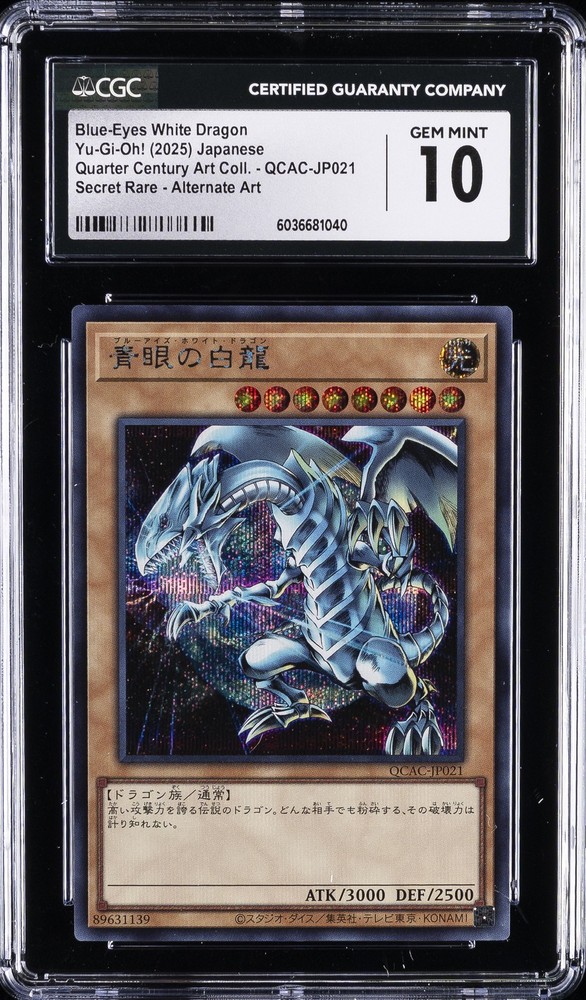 2025 YU-GI-OH! JAPANESE QUART CENT. ART COLL. -25TH SECRET RARE - ALT. ART #QCAC-JP021 BLUE-EYES WHITE DRAGON CGC 10 GEM MINT 2025 YU-GI-OH! JAPANESE QUART CENT. ART COLL. -25TH SECRET RARE - ALT. ART #QCAC-JP021 BLUE-EYES WHITE DRAGON CGC 10 GEM MINT Purchase Info Thank you for your interest in bidding on this item consigned with PSA! By bidding on this item, you acknowledge and agree to the following terms: All sales are final. Returns not accepted. Payment must be made within 7 days of auction close. All items are sold "as is" and without warranty of Collectors Universe, Inc. (d/b/a PSA), and ANY AND ALL IMPLIED WARRANTIES ARE DISCLAIMED AND EXCLUDED. Sales tax may apply depending on shipping address. PSA does not guarantee that another third-party grading company's authentication or certification of an item as genuine is correct or accurate. Neither a difference of opinion between third-party grading companies about authenticity, nor a company's subsequent reversal of its earlier authentication or certification of an item, will be a basis for rescinding a sale. Any dispute with another third-party grading company relating to the authenticity of an item must be resolved directly with that other company. Collectors' maximum liability in the event of loss or damage to an item during shipping will be the lesser of (a) the price paid for the item and (b) the change in fair market value of the item. You release Collectors from all other liability including for any claims of punitive damages, emotional distress, consequential damages, lost profits, or lost interest, except as prohibited by law. Shipping Purchased Items will be shipped directly from PSA Vault. You stay hands-free. PSA Vault When you purchase this item, you can save on sales tax and selling fees by keeping it in the PSA Vault, official Vault of eBay. Items already in PSA Vault and will be sent to PSA Vault will have no shipping charge Storage of any items with the PSA Vault will be subject to the PSA Vault Terms of Service. Consignment PSA has competitive auction rates on the world's largest collectibles marketplace with the option to list from the PSA Vault or immediately after PSA authentication and grading. Sale Price Under $100 $100 - $499 $500 - $999 $1,000 - $2,499 $2,500 - $4,999 $5,000+ Seller Fee 13% + $3 flat 13% 12% 10% 9% 7% Sellers pay a single fee as reflected above; no additional eBay fees are incurred.