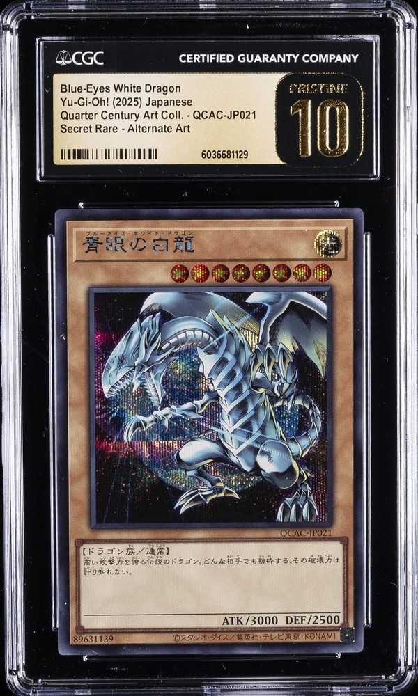 2025 YU-GI-OH! JAPANESE QUARTER CENTURY ART COLL. - SECRET RARE - ALT. ART #QCAC-JP021 BLUE-EYES WHITE DRAGON CGC 10 PERFECT 2025 YU-GI-OH! JAPANESE QUARTER CENTURY ART COLL. - SECRET RARE - ALT. ART #QCAC-JP021 BLUE-EYES WHITE DRAGON CGC 10 PERFECT Purchase Info Thank you for your interest in bidding on this item consigned with PSA! By bidding on this item, you acknowledge and agree to the following terms: All sales are final. Returns not accepted. Payment must be made within 7 days of auction close. All items are sold "as is" and without warranty of Collectors Universe, Inc. (d/b/a PSA), and ANY AND ALL IMPLIED WARRANTIES ARE DISCLAIMED AND EXCLUDED. Sales tax may apply depending on shipping address. PSA does not guarantee that another third-party grading company's authentication or certification of an item as genuine is correct or accurate. Neither a difference of opinion between third-party grading companies about authenticity, nor a company's subsequent reversal of its earlier authentication or certification of an item, will be a basis for rescinding a sale. Any dispute with another third-party grading company relating to the authenticity of an item must be resolved directly with that other company. Collectors' maximum liability in the event of loss or damage to an item during shipping will be the lesser of (a) the price paid for the item and (b) the change in fair market value of the item. You release Collectors from all other liability including for any claims of punitive damages, emotional distress, consequential damages, lost profits, or lost interest, except as prohibited by law. Shipping Purchased Items will be shipped directly from PSA Vault. You stay hands-free. PSA Vault When you purchase this item, you can save on sales tax and selling fees by keeping it in the PSA Vault, official Vault of eBay. Items already in PSA Vault and will be sent to PSA Vault will have no shipping charge Storage of any items with the PSA Vault will be subject to the PSA Vault Terms of Service. Consignment PSA has competitive auction rates on the world's largest collectibles marketplace with the option to list from the PSA Vault or immediately after PSA authentication and grading. Sale Price Under $100 $100 - $499 $500 - $999 $1,000 - $2,499 $2,500 - $4,999 $5,000+ Seller Fee 13% + $3 flat 13% 12% 10% 9% 7% Sellers pay a single fee as reflected above; no additional eBay fees are incurred.