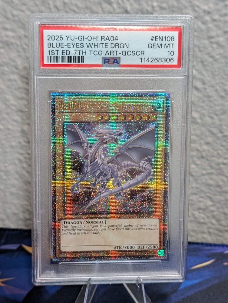 This is a Blue Eyes White Dragon 7th art 1st edition quarter century secret rare card from the 2025 Quarter Century Stampede set. The card was graded a 10 GEM MINT from PSA. The slab will be cardboard covered & bubble mailed for shipping. We have many other listings like this on our page, please take a look!