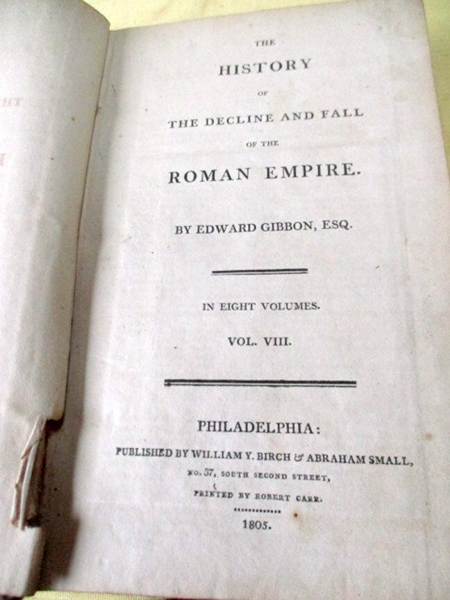 ENLARGED PICTURES!! Please scroll ALL the way down to view LARGER images. A 1161. Volumes 7 and 8 only. Both volumes with large Folding map in front. (please see pictures). Pub. Wm. Birch & A. Small, Philadelphia. 1805. Octavo. Volume 7,458 pages. Folding map with closed tear in front and folding map in rear; Volume 8, 283 pages, 64 page general index. Memoir of Gibbon. 130 pages 2 page ads. Folding map in front of Eastern part of Empire, foxed. Both copies, strong. Very Good minus, condition. Please do not hesitate to e-mail with any questions. As Always, Satisfaction Guaranteed! PAYMENT: PayPal, because eBay requires sellers to list electronic payments exclusively. I expect to receive payment within 10 days, unless we have made other arrangements. MEDIA MAIL: The majority of my books are sent Media Mail to U.S. customers. I add $1.00 for shipping materials, etc. (The shipping price that you see at the top of the page includes the handling fee.) PRIORITY MAIL: I will send both Media cost and Priority cost with invoice, on books which seem to warrant Priority service or when buyer requests it. I'm glad to combine multiple purchases in order to minimize shipping costs. I WILL SHIP INTERNATIONALLY, and I try to be as economical as possible with the shipping costs. Whenever a book will fit comfortably in a Priority Flat Rate Envelope, I'll send it that way. RETURN POLICY: Satisfaction Guaranteed! Payment I accept the following forms of payment: PayPal Shipping & Handling I'm glad to combine multiple purchases for less expensive shipping costs. US Shipping Please check eBay's Shipping & Payment tab USPS Media Mail® International Shipping Please check eBay's Shipping & Payment tab USPS Priority Mail International FREE scheduling, supersized images and templates. Get Vendio Sales Manager. FREE scheduling, supersized images and templates. Get Vendio Sales Manager. Over 100,000,000 served. Get FREE counters from Vendio today!
